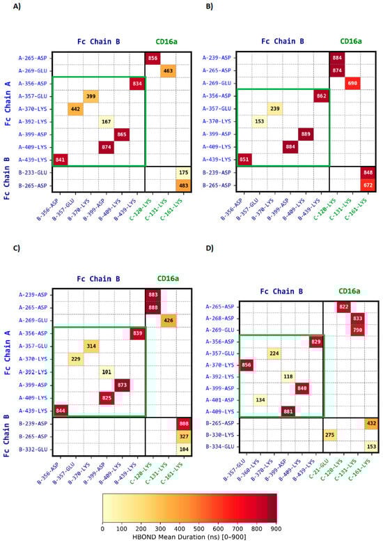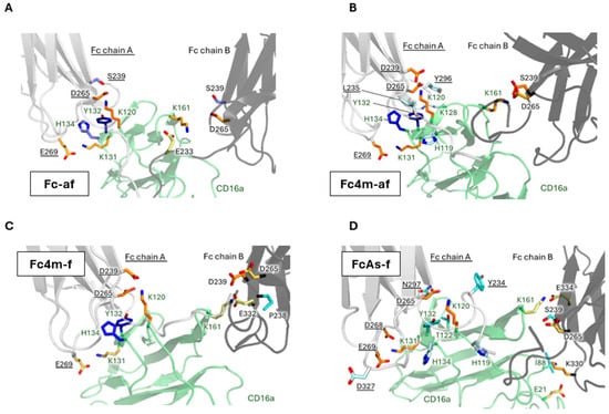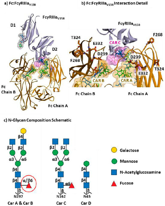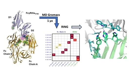 Background/Objectives: Antibody-dependent cellular cytotoxicity relies on the interaction between the Fc region of immunoglobulin G1 (IgG1) and the CD16a receptor. While removal of core fucosylation on Fc and introduction of the DFTE mutation set (S239D, H268F, S324T, I332E) are known to enhance CD16a binding, the detailed contributions of these engineered sites in solution remain incompletely defined. Methods: Here, we employed 1 µs molecular dynamics simulations to map, at atomic resolution, the interaction networks stabilizing pre-formed Fc-CD16a complexes, including afucosylated Fc-wild-type, DFTE-engineered, Fc-fucosylated, and asymmetrically engineered Fc variants. Results: Our results show that only S239D, present on both Fc chains, and H268F on chain A consistently contribute to stabilizing the CD16a interface, while I332E does not form persistent interactions. Glycan–protein contacts are primarily intrachain, with transient interchain glycan–glycan interactions not contributing significantly to complex stability. Fucosylation on Fc significantly reduces binding stability by disrupting peripheral interactions and critical glycan-mediated contacts. Notably, the asymmetric Fc variant, in which the two heavy chains carry distinct sets of substitutions, retains high-affinity binding despite lacking S239D and carrying core fucose, through a novel hydrophobic cluster and reinforced peripheral electrostatic interactions. Conclusions: Altogether, these findings provide a quantitative framework for how targeted mutations and fucose modifications remodel Fc-CD16a interactions, offering insights for the rational design of next-generation therapeutic antibodies. Full article