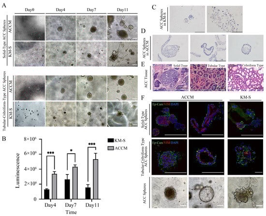 Salivary adenoid cystic carcinoma (ACC) is a highly aggressive salivary gland malignancy characterized by infiltrative growth patterns that hinder complete resection. Lacking effective chemotherapy, recurrent or metastatic ACC remains clinically incurable. This research aimed to develop an efficient culture system for ACC organoids, which can preserve tumor heterogeneity and establish a reliable drug screening platform. Under our optimized culture conditions, ACC organoids grew rapidly and successfully recapitulated three characteristic histopathological patterns. Whole-genome sequencing (WGS) further confirmed they mirrored the genomic features of their parental tumors, including significantly mutated genes, non-coding regulatory region mutations, copy number variation, and minor allele frequency. RNA sequencing confirmed that ACC organoids recapitulated the MYB-NFIB fusion gene. At the protein level, these organoids contained multiple cellular components, including epithelial cells, mesenchymal cells, K7+ duct cells, a-SMA+ myoepithelial cells, K5+ basement membrane cells, and CD44+ tumor stem cells, with proper spatial distribution patterns. With an 88% success rate, the first ACC organoid platform, incorporating normal salivary gland (SG) organoids as toxicity controls, enabled high-throughput drug testing within two weeks. In conclusion, we developed an efficient culture system for ACC organoids that can preserve tumor heterogeneity and establish a reliable drug screening platform for mechanistic studies and personalized precision therapy research. Full article