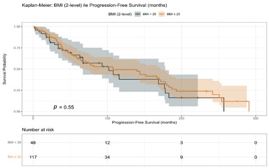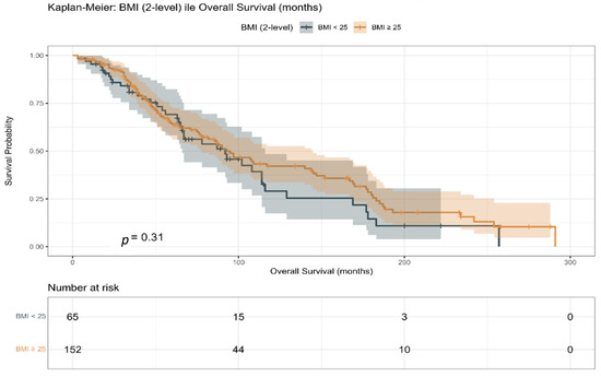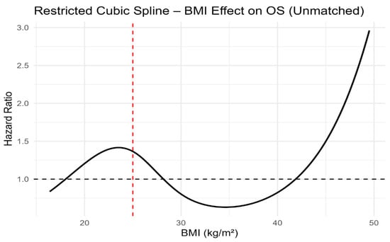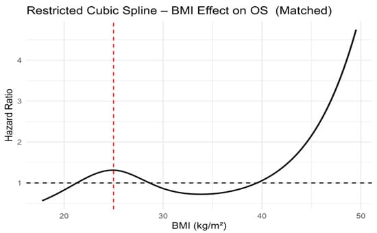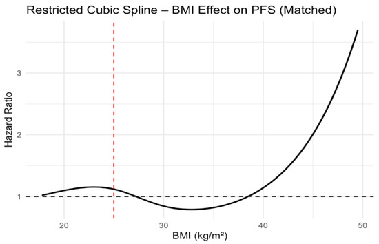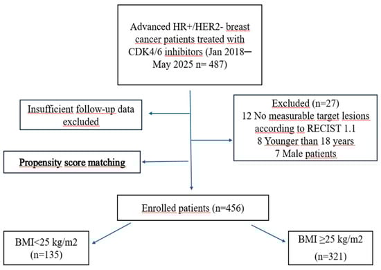 Background: Body mass index (BMI) has been widely investigated as a potential prognostic factor in breast cancer; however, its clinical relevance in patients with hormone receptor-positive/human epidermal growth factor receptor 2-negative (HR+/HER2−) metastatic breast cancer treated with CDK4/6 inhibitors remains controversial, particularly in contemporary real-world settings. This study aimed to evaluate the association between baseline BMI and clinical outcomes, including survival and treatment-related toxicity, in a real-world cohort. Methods: This single-centre retrospective observational cohort study included patients with HR+/HER2− metastatic breast cancer treated with endocrine therapy and a CDK4/6 inhibitor (palbociclib or ribociclib) in the metastatic setting between January 2018 and May 2025. Patients were categorised by baseline BMI (<25 vs. ≥25 kg/m2). Progression-free survival (PFS) and overall survival (OS) were assessed using the Kaplan–Meier method and Cox proportional hazards models. To minimise confounding, propensity score matching (PSM) with a 1:3 nearest-neighbour algorithm was performed. Non-linear associations between continuous BMI and survival outcomes were explored using restricted cubic spline analyses. Treatment-related adverse events were evaluated according to CTCAE v5.0. Results: A total of 456 patients were included; 321 (70.4%) had a BMI ≥ 25 kg/m2, and 135 (29.6%) had a BMI < 25 kg/m2. Propensity score matching produced a balanced cohort of 220 patients. The reduction in sample size after matching reflects the need to achieve close baseline comparability between groups. In the matched cohort, no statistically significant differences in PFS (log-rank p = 0.55) or OS (log-rank p = 0.31) were observed across BMI categories. BMI was not an independent predictor of PFS or OS in multivariable analyses. However, restricted cubic spline modelling revealed a non-linear relationship between continuous BMI and survival outcomes, with increased risk at extreme BMI values, underscoring the limitations of dichotomous BMI categorisation. Conclusions: In this real-world cohort of patients with HR+/HER2− metastatic breast cancer treated with CDK4/6 inhibitors, dichotomised BMI categories were not independently associated with survival outcomes. However, modelling BMI as a continuous variable revealed a non-linear (U-shaped) relationship, with increased risk at both the low and high ends of the BMI distribution. These findings suggest that the prognostic impact of BMI is non-linear and may be obscured by simple dichotomous categorisation. Full article