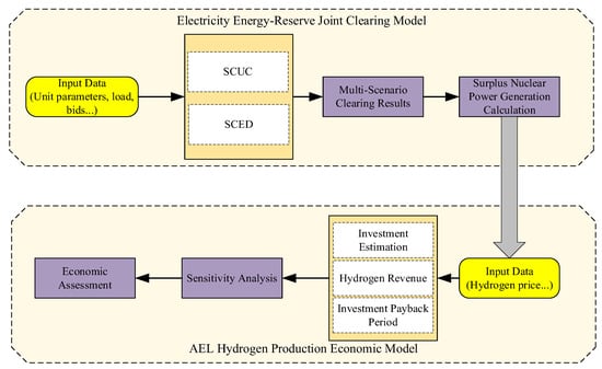 Under high renewable energy penetration, nuclear power units face significant challenges in peak regulation and market clearing due to constraints on minimum technical output and ramping capability. To address this issue, a long-term power system of Guangdong Province in 2035 is taken as the study case, and an energy–reserve co-clearing simulation framework based on Security-Constrained Unit Commitment (SCUC) and Security-Constrained Economic Dispatch (SCED) is established to systematically evaluate the clearing performance of nuclear power and the formation mechanism of residual electricity under multiple market scenarios. On this basis, a nuclear power-coupled Alkaline Electrolysis (AEL) hydrogen production pathway is proposed as a peak-shaving utilization option, and an economic assessment model for nuclear-based hydrogen production is developed to quantify the investment performance under different hydrogen production capacities and operating modes. The results indicate that the integration of an AEL hydrogen production system can effectively alleviate the rigidity of nuclear power output. Under the “12-3-48-3” flexible peak-shaving mode, the residual electricity available for hydrogen production increases by approximately 30% compared with a typical peak-shaving strategy. Under scenarios with low electricity prices and green hydrogen prices, when the hydrogen production capacity is configured at 50–100 MW, the investment payback period is approximately six years, and the project exhibits strong economic robustness against variations in the discount rate. These findings demonstrate that nuclear-based hydrogen production is economically feasible in future power systems with high renewable penetration, providing quantitative support for nuclear flexibility enhancement and the coordinated development of low-carbon energy systems. Full article