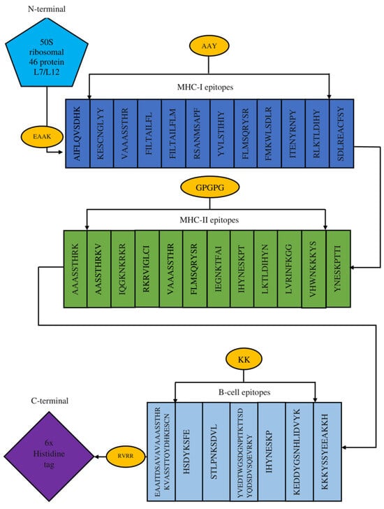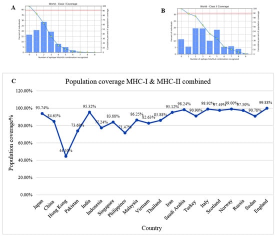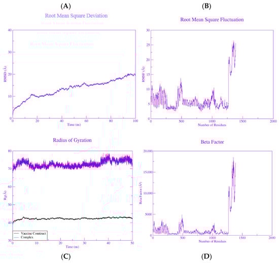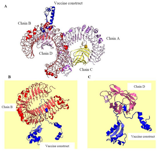 Monkeypox virus, a zoonotic DNA virus belonging to the Orthopoxvirus genus, has emerged as a global health issue because of its fast spread to 104 nations over six continents. In the current study, an immunoinformatics pipeline was used to design a multiepitope-based prophylactic vaccine targeting the A35R glycoprotein and E8L membrane proteins of the monkeypox virus. Selected target proteins were surface-exposed, non-homologous to the human proteome, and essential for viral pathogenesis. B-cell and T-cell (MHC-I and MHC-II) epitopes with high antigenicity (>0.5), non-allergenicity, non-toxicity, and highly soluble in water with strong affinity towards innate and adaptive receptors, were prioritized. Shortlisted epitopes were combined to design the final vaccine utilizing an adjuvant (50S ribosomal L7/L12) and appropriate linkers for improved immunogenicity. Population coverage analysis showed wide HLA representation with 83.57% (MHC-I) and 88.8% (MHC-II) global coverage, including 89.6% for West Africa and 87.3% for Central Africa. Docking analysis of the vaccine construct with the TLR-4 receptor revealed stable interactions (−695.6 kcal/mol). Molecular dynamics simulations and binding free energies further confirmed structural stability. Immune simulations predicted strong activation of both humoral and cellular immune responses. These results indicate that the designed multiepitope vaccine construct is a viable option for additional experimental validation against the monkeypox virus. Full article