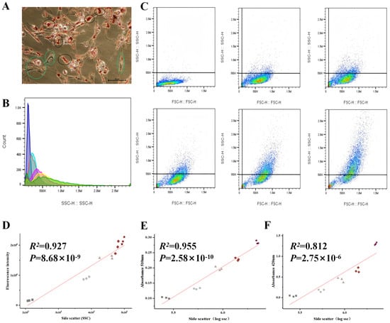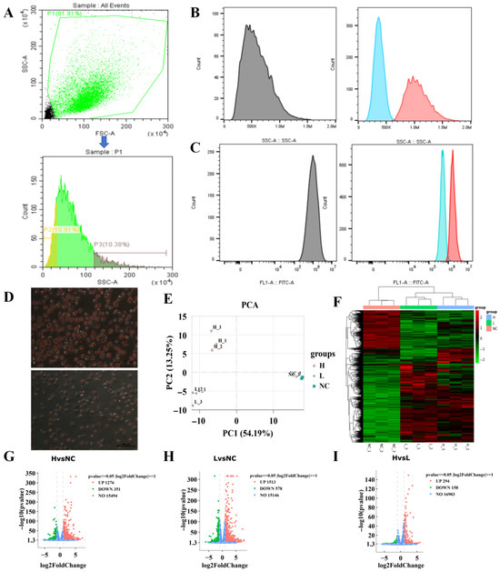 p < 0.001) between the SSC signal and lipid droplet content via fluorescence staining of lipid droplets, Oil Red O staining, and triglyceride (TG) quantification. Based on this, a label-free sorting strategy using SSC signals was established to sort differentiated chicken preadipocytes, obtaining high lipid droplet (H) and low lipid droplet (L) subpopulations, which were subsequently subjected to transcriptome sequencing and differential gene expression (DEG) analysis, followed by GO and KEGG enrichment analysis. The results indicated no significant differences in the expression of adipogenesis marker genes (