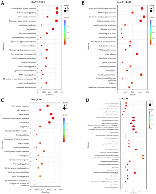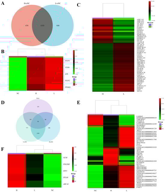 PLIN2) between the high lipid droplet (H) and low lipid droplet (L) groups, suggesting that both groups are at similar stages of differentiation. KEGG analysis revealed that both the H vs. NC and L vs. NC comparisons were enriched in common pathways, including the PPAR signaling pathway, ECM–receptor interaction, focal adhesion, cytokine–receptor interaction, and calcium–Apelin signaling pathway, suggesting that both groups of cells had activated the adipogenesis program. GO analysis showed that, in both H vs. NC and L vs. NC comparisons, differentially expressed genes (DEGs) were enriched in biological processes (BPs) related to cell adhesion, nucleosome assembly, chromatin remodeling, and receptor activity, as well as cellular components (CCs) such as the extracellular matrix, cytoskeleton, and nucleosome organization, indicating extensive gene reprogramming and activation of signaling transduction during differentiation. In the H vs. L comparison, enriched pathways included ABC transporters, ECM–receptor interaction, focal adhesion, gap junctions, microtubule-related processes, and neuroactive ligand–receptor interactions, involving lipid transmembrane transport, cytoskeleton stabilization, and signal transduction regulation, suggesting that high lipid droplet cells are more mature in lipid droplet transport, storage, and homeostasis maintenance. GO enrichment results further supported this conclusion, as H vs. L specifically enriched processes related to microtubule-related processes, cell cycle, and redox reactions (BPs), as well as chromosome organization, cytoskeleton, and motor activity (CC/MF), indicating that high lipid droplet cells maintain lipid droplet fusion and metabolic homeostasis via enhanced microtubule transport and antioxidant regulation. Differential gene analysis revealed that the L group upregulated genes associated with fatty acid synthesis and elongation (