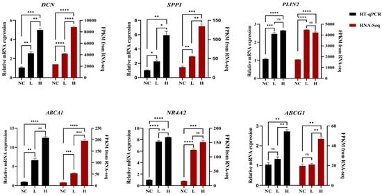 HMOX1), exhibiting a storage and homeostasis-oriented metabolic state. In the NC, L, and H groups, the expression of five genes—