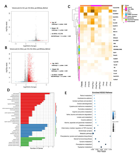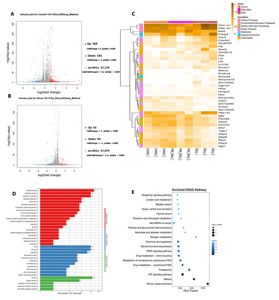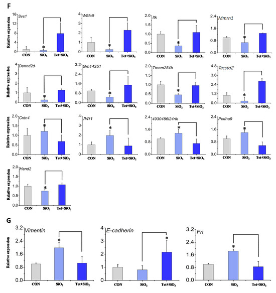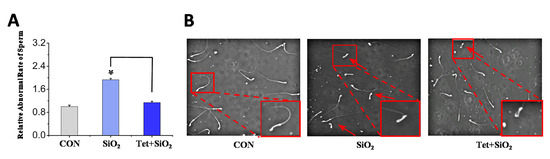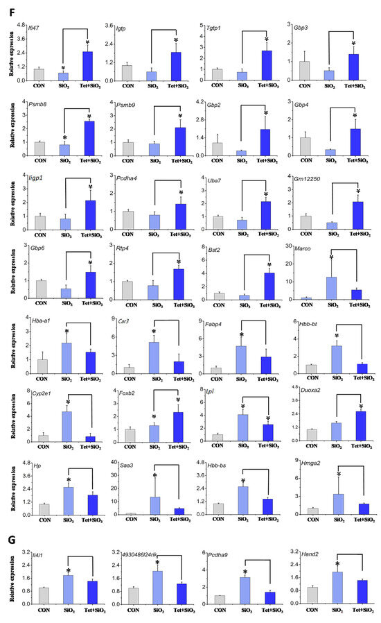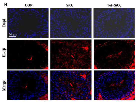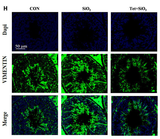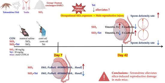 The long-term inhalation of free silica dust causes silicosis—a prevalent occupational hazard—yet its systemic effect on male reproductive toxicity remains underexplored. Tetrandrine (Tet) is the only plant-derived anti-silicosis drug approved in China. This study investigates silica (SiO2) -induced male reproductive damage and evaluates Tet’s protective effects. Sixty male C57BL/6 mice (6–8 weeks) were divided into control, SiO2 exposure, and SiO2 + Tet groups. SiO2 was administered via intranasal infusion and Tet via gavage. Mice were sacrificed at day 7 (male reproductive injury model corresponding to the pulmonary inflammation stage) and day 42 (male reproductive injury model corresponding to the pulmonary fibrosis stage). Analyses included sperm morphology, testicular transcriptome sequencing, RT-qPCR, and immunofluorescence. At day 7, SiO2 exposure upregulated testicular inflammatory markers, which were partially mitigated by Tet. At day 42, SiO2 increased sperm deformity and testicular fibrosis markers (fibronectin and vimentin); Tet intervention reduced these abnormalities. Transcriptome analysis revealed distinct gene expression patterns at day 7 versus day 42, indicating time-dependent injury mechanisms. Tetrandrine alleviates silica-induced reproductive damage in male mice, suggesting potential therapeutic applications for occupational silica exposure and expanding the understanding of silica toxicity beyond the respiratory system. Full article
