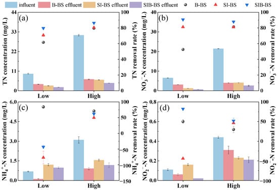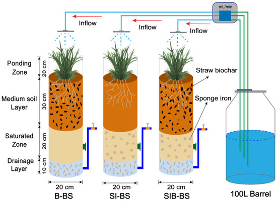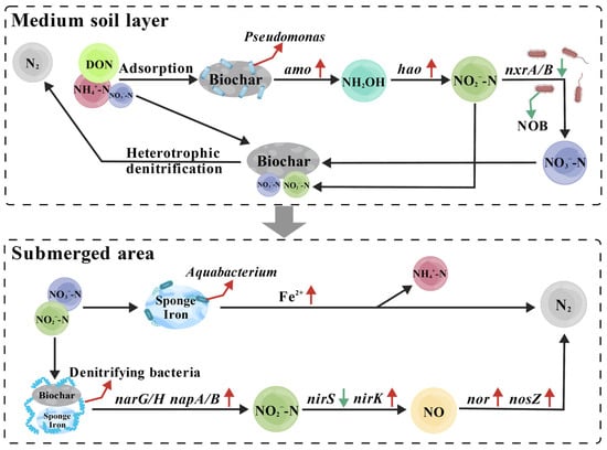 To address the challenge of low nitrogen removal efficiency, particularly the difficulty in meeting total nitrogen (TN) discharge standards during low-temperature seasons and intermittent emission modes in conventional aquaculture wastewater treatment, this study proposed the novel application of bioretention systems. Biochar and sponge iron were used as fillers to construct three bioretention systems: biochar-based (B-BS), sponge iron-based (SI-BS), and a composite system (SIB-BS), for evaluating their nitrogen removal performance for aquaculture wastewater treatment. Experimental results demonstrated that under intermittent flooding conditions at 8.0–13.0 °C and increasing TN loading (9.48 mg/L–31.13 mg/L), SIB-BS maintained stable TN removal (79.7–86.7%), outperforming B-BS and SI-BS (p < 0.05). Under continuous inflow (influent TN = 8.4 ± 0.5 mg/L) at 8.0–13.0 °C, SIB-BS achieved significantly lower effluent TN (2.57 ± 1.5 mg/L) than B-BS (5.6 ± 1.6 mg/L) and SI-BS (5.0 ± 1.5 mg/L) (p < 0.05). Meanwhile, when the temperature ranged from 8.0 to 26.3 °C, SIB-BS exhibited a more stable and efficient denitrification ability. Mechanistic investigations revealed that coupling biochar with sponge iron promoted denitrifying microbial activity and enhanced the functional potential for nitrogen transformation (p < 0.05). Specifically, biochar provided porous attachment sites and improved mass transfer, while sponge iron supplied readily available Fe2+ as an electron donor; their combination buffered iron oxidation and facilitated Fe2+-mediated electron transfer. At low temperature, SIB-BS further stimulated extracellular polymeric substances (EPS) secretion, strengthened biofilm stability without causing blockage, and improved the protective interactions between fillers, thereby increasing metabolic efficiency and sustaining TN removal under variable loading. This study provided a technical reference for the efficient denitrification of aquaculture wastewater. Full article