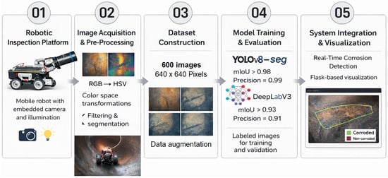 Corrosion in steel pipelines can cause critical failures in industrial systems, while conventional inspection methods such as radiography and ultrasonic testing are costly and require specialized personnel. This study presents a mobile computer vision system for automated corrosion detection inside steel pipes using deep learning-based visual analysis. The proposed system consists of a Raspberry Pi 4-based mobile robot equipped with a high-resolution camera for internal inspection. Acquired images were processed using color-space transformations (RGB–HSV), filtering, and segmentation. Convolutional neural networks and semantic segmentation models, including YOLOv8-seg (Instance segmentation) and DeepLabV3 (Semantic segmentation), were trained on a custom corrosion image dataset to identify corroded regions. Real-time visualization was implemented via Flask-based video streaming. Experimental results demonstrated high detection accuracy for uniform corrosion, achieving a mean Intersection over Union (mIoU) above 0.98 and a precision of 0.99 with the YOLOv8-seg model. These results indicate that the proposed system enables reliable and automated corrosion inspection, with the potential to reduce inspection costs and improve operational efficiency. Future work will focus on enhancing real-time performance through hardware optimization. Full article