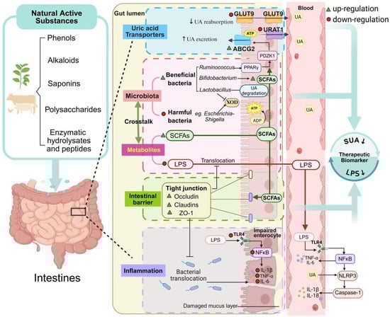 Hyperuricemia, a common metabolic disorder characterized by elevated serum uric acid (UA) levels, can lead to severe complications such as gout and renal impairment. Conventional therapies, while effective, are frequently accompanied by significant adverse effects, underscoring the urgent need for safer therapeutic alternatives. Recent evidence identifies the intestine as a novel, pivotal regulator of UA homeostasis, presenting a promising therapeutic axis. This review delineates the intestinal mechanisms governing UA regulation and evaluates the therapeutic potential of natural active substances that target these pathways. We conducted a comprehensive review of recent preclinical studies focusing on intestinal mechanisms involved in UA metabolism, including the roles of gut microbiota, urate transport proteins, intestinal barrier function, and inflammation. Studies evaluating natural active substances—such as polyphenols, polysaccharides, peptides, and plant extracts—were systematically analyzed for their effects on gut-mediated UA regulation. Natural active substances have been shown to effectively alleviate hyperuricemia by modulating gut microbiota, enhancing UA intestinal excretion, reinforcing intestinal barrier function, and suppressing inflammatory pathways. Collectively, these findings demonstrate the multi-target efficacy of natural active substances within the intestines, offering a promising therapeutic strategy that warrants further investigation into nutrition-based intestinal interventions and novel pharmacological treatments for hyperuricemia. Full article