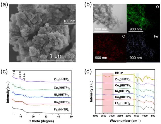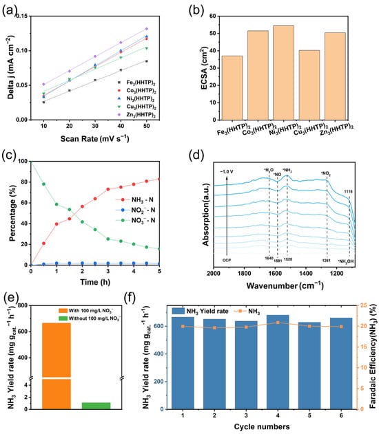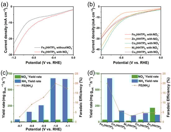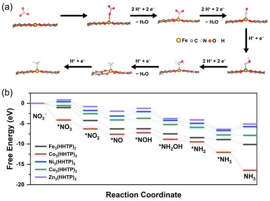 Nitrate pollution in groundwater poses severe threats to ecosystems and human health, making the electrochemical nitrate reduction reaction (NO3RR) a promising remediation technology. Conductive metal–organic frameworks (cMOFs) with π-d conjugation, dispersed active sites, and tunable structures are ideal candidates for electrocatalysis. Herein, we synthesized a series of cMOFs (M3(HHTP)2, M = Fe, Zn, Cu, Co, Ni) via conjugated coordination between hexahydroxytriphenylene (HHTP) ligands and metal ions and systematically investigated their NO3RR performance. Electrochemical tests revealed that Fe3(HHTP)2 exhibits superior catalytic performance for nitrate reduction, achieving a high NH3 selectivity of 99.5% and a yield rate of 676.4 mg·gcat−1·h−1 at −1.0 V vs. RHE (reversible hydrogen electrode), along with excellent cyclic and structural stability. In situ attenuated total reflection Fourier transform infrared (ATR-FTIR) spectroscopy identified key intermediates (*NO2, *NH2OH) and proposed the reaction pathway: NO3 → *NO3 → *NO2 → *NO → *NOH → *NH2OH → *NH2 → *NH3. DFT calculations revealed that Fe center exhibited a lower energy barrier for NO3RR compared to other metal ions (Zn, Cu, Co, Ni). This study demonstrates the significant potential of Fe3(HHTP)2 for efficient NO3RR and provides new insights into the structure-function relationship of cMOF-based electrocatalysts. Full article