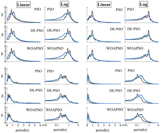 This paper proposes two improved algorithms, the DE-PSO algorithm, which combines differential evolution and phased strategy, and the hybrid particle swarm optimization algorithm integrating whale algorithm (WOAPSO), which combines the whale optimization mechanism. Compared to traditional calibration methods (such as the Newmark three- and two-parameter methods), which rely on empirical simplified models, adapting them to the complex seismic nonstationarity and multipeak characteristics is difficult. However, although intelligent optimization algorithms, such as particle swarm optimization (PSO) and differential evolution (DE) have improved calibration accuracy in recent years, insufficient convergence stability and low computational efficiency, among other problems, persist. Therefore, based on experiments, the performances of these algorithms were compared with those of standard PSO, traditional DE, and other algorithms. The results demonstrate the significant superiority of DE-PSO and WOAPSO. In 50 repeated experiments, the fitness standard deviation (STD) was significantly reduced, and the algorithms achieved rapid convergence by the mid-iteration stage, which effectively resolves the issues of premature convergence and local oscillation tendencies inherent in the standard Particle Swarm Optimization algorithm. Regarding the key parameters (Tg, βmax, γ) of the standard, the STD of the improved algorithm approached zero, verifying its strong adaptability to multimodal optimization problems. Furthermore, the DE-PSO algorithm had the best performance in balancing computational efficiency and stability, with a convergence speed that is three times faster than that of standard DE algorithm while maintaining the lowest parameter volatility. This study provides an efficient algorithmic tool for the rapid analysis of strong motion records and the efficient calibration of design response spectra, which has implications for the seismic optimization design of complex structures and can be guided by regulations, contributing to engineering seismic practice. Full article