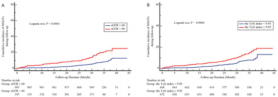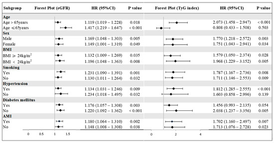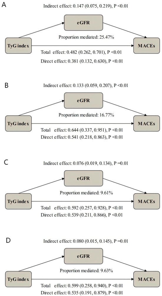 Background: Despite percutaneous coronary intervention (PCI) for revascularization, patients with acute coronary syndrome (ACS) still face residual risks of adverse outcomes. Insulin resistance (IR) and renal impairment are independent predictors of poor prognosis in these patients, yet their interaction and underlying mechanisms linked to post-PCI outcomes remain incompletely elucidated. Methods: A retrospective cohort study was conducted involving patients with ACS who underwent PCI at the Third People’s Hospital of Chengdu from July 2018 to December 2020. Insulin resistance (IR) was quantified using the triglyceride–glucose (TyG) index, and renal function was evaluated via the estimated glomerular filtration rate (eGFR). The primary endpoint was major adverse cardiovascular events (MACEs), a composite of all-cause death, non-fatal myocardial infarction, non-fatal stroke, and unplanned revascularization. Multivariable Cox proportional hazards regression and mediation analyses were applied to explore the associations of TyG index and eGFR with patient prognosis, and to quantify the mediating effect of eGFR on the relationship between TyG index and prognosis. Results: A total of 1340 patients with ACS were included in the final analysis. Over a median follow-up duration of 31.02 (interquartile range [IQR]: 27.34–35.03) months, 124 patients (9.25%) experienced MACEs. After adjusting for potential confounders, both the TyG index and eGFR were identified as significant independent predictors of MACEs in the overall population and across predefined subgroups. Specifically, each one-unit increase in the TyG index was associated with a 73.8% higher risk of MACEs (HR 1.738; 95% CI 1.273–2.372), whereas each ten-unit decrease in eGFR was linked to a 12.7% increased MACEs risk (HR 1.127; 95% CI 1.032–1.232). Importantly, after further adjustment for confounders, eGFR significantly mediated 9.63% of the total effect of the TyG index on MACEs risk. Conclusions: Renal impairment partially mediates the association between IR and adverse cardiovascular outcomes in ACS patients undergoing PCI. This finding underscores the clinical importance of the metabolic–cardiorenal axis in this population, suggesting that a comprehensive assessment targeting both IR and renal function-related pathways may enhance risk-stratification accuracy and optimize therapeutic strategies for ACS patients. Full article