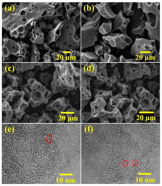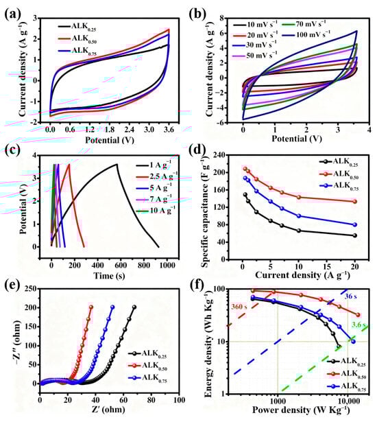 The development of porous carbon materials that meet the demands of commercial supercapacitors is challenging, primarily due to the requirements for high energy and power density, as well as large-scale manufacturing capabilities. Herein, we present a sustainable and cost-effective method for synthesizing N–O–S co-doped hierarchical porous carbons (designated as ALKx) from ammonium lignosulfonate (AL), an industrial by–product. This process employs a low KOH/AL mass ratio (x ≤ 0.75) and a carbonization temperature of 900 °C. The resulting materials, ALK0.50 and ALK0.75, exhibit an exceptionally high specific surface area (>2000 m2 g−1), a well-balanced micro-mesoporous structure, and tunable heteroatom content, which collectively enhance their electrochemical performance in both aqueous and ionic liquid electrolytes. Notably, ALK0.75 features a heteroatom content of 13.2 at.% and a specific surface area of 2406 m2 g−1, owing to its abundant small mesopores. When tested as an electrode in a two–electrode supercapacitor utilizing a 6 M KOH electrolyte, it achieves a high specific capacitance of 250 F g−1 at a current density of 0.25 A g−1 and retains 197 F g−1 even at 50 A g−1, demonstrating remarkable rate capability. In contrast, ALK0.50, characterized by a lower heteroatom content and an optimized pore structure, exhibits superior compatibility with the ionic liquid electrolyte EMIMBF4. A symmetric supercapacitor constructed with ALK0.50 electrodes attains a high energy density of 90.2 Wh kg−1 at a power density of 885.5 W kg−1 (discharge time of 60 s). These findings provide valuable insights into heteroatom doping and the targeted regulation of pore structures in carbon materials, while also highlighting new opportunities for the high-value utilization of AL. Full article