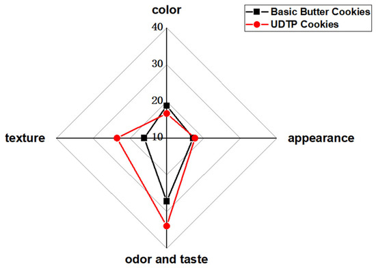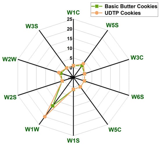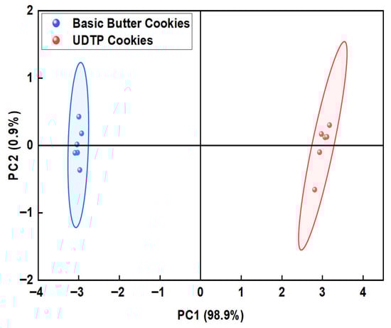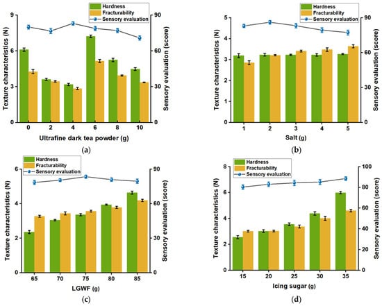 Ultrafine dark tea powder (UDTP) was prepared by superfine grinding and sieving through a 200-mesh sieve, and incorporated into cookies to improve their textural properties, sensory acceptability and flavor characteristics. Through single-factor experiments and orthogonal testing, the optimal formulation was determined. The quality of cookies was evaluated by texture analysis, sensory evaluation, electronic nose (E-nose), and gas chromatography-mass spectrometry (GC-MS). Results showed that cookies supplemented with 4 g UDTP per 80 g butter exhibited significantly lower hardness and comparable fracturability, along with higher sensory scores in texture, odor and taste compared to basic butter cookies. E-nose and GC-MS analyses revealed that UDTP enrichment promoted the formation of desirable volatile compounds, particularly aldehydes, ketones, and heterocyclic compounds, which contributed to floral, fruity, roasted nutty, and caramel aromas. This study demonstrates that UDTP can effectively improve both the textural and flavor properties of cookies, providing a viable approach for developing tea-fortified baked products with enriched sensory profiles. Full article