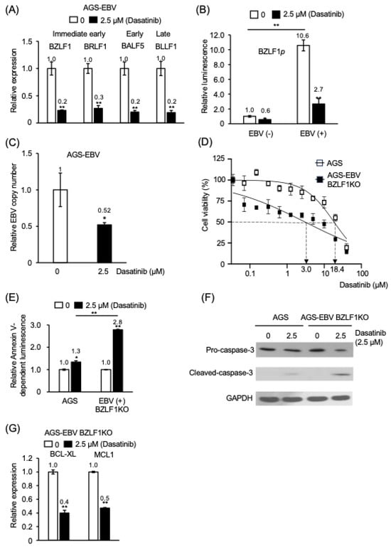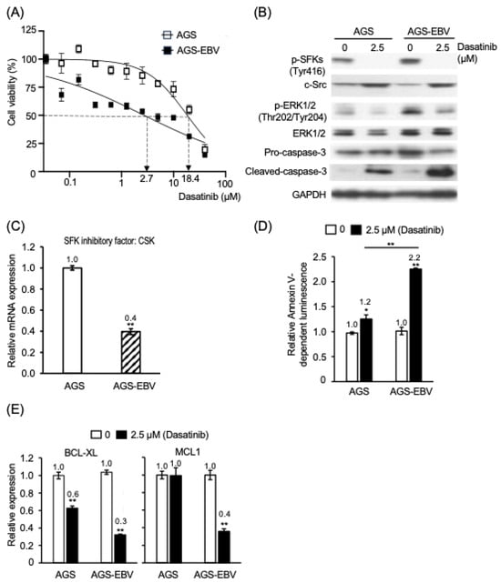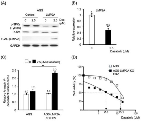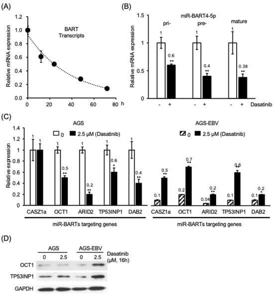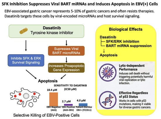 Background/Objectives: Epstein–Barr virus (EBV) is associated with a subset of gastric carcinomas characterized by latency programs that promote survival of infected cells. EBV-encoded BamH I A rightward transcript (BART) microRNAs contribute to apoptosis resistance in infected epithelial cells. This study investigated whether dasatinib, a Src family kinase (SFK) inhibitor, selectively targets EBV-positive gastric epithelial cells and examined the molecular mechanisms underlying this effect. Methods: EBV-positive and EBV-negative gastric epithelial cell models were analyzed to evaluate cell viability, apoptosis induction, signaling pathways, and viral gene regulation. BART miRNA expression was quantified by RT-qPCR, and promoter activity was examined using luciferase reporter assays. Downstream target gene expression was analyzed at both the transcript and protein levels. Recombinant EBV lacking BZLF1 or LMP2A was used to assess the contributions of lytic activation and LMP2A-associated signaling. Results: Dasatinib preferentially reduced viability and induced apoptosis in EBV-positive gastric epithelial cells compared with EBV-negative counterparts. Treatment suppressed phosphorylation of Src and ERK and reduced expression of the anti-apoptotic proteins BCL-xL and MCL1. Apoptosis was also observed in cells infected with LMP2A-deficient EBV, suggesting that the effect cannot be fully explained by inhibition of LMP2A-associated signaling. Dasatinib inhibited BART miRNA promoter activity and reduced pri-, pre-, and mature miR-BART levels, accompanied by increased expression of pro-apoptotic target genes including CASZ1a, OCT1, ARID2, TP53INP1, and DAB2. In parallel, dasatinib suppressed BZLF1 promoter activity without evidence of lytic reactivation. Conclusions: Dasatinib promotes apoptosis in EBV-positive gastric epithelial cells in association with coordinated suppression of SFK signaling and EBV-encoded BART miRNA expression, accompanied by derepression of pro-apoptotic cellular genes. These findings reveal a previously underappreciated vulnerability of EBV-positive epithelial cells and suggest that targeting host kinase signaling pathways that regulate viral microRNAs may represent a potential therapeutic strategy for EBV-associated malignancies. Full article