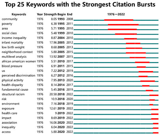 Considerable scholarly attention has been directed to the adverse health effects caused by residential segregation. We aimed to visualize the state-of-the-art residential segregation and health research to provide a reference for follow-up studies. Employing the CiteSpace software, we uncovered popular themes, research hotspots, and frontiers based on an analysis of 1211 English-language publications, including articles and reviews retrieved from the Web of Science Core Collection database from 1998 to 2022. The results revealed: (1) The Social Science & Medicine journal has published the most studies. Roland J. Thorpe, Thomas A. LaVeist, Darrell J. Gaskin, David R. Williams, and others are the leading scholars in residential segregation and health research. The University of Michigan, Columbia University, Harvard University, the Johns Hopkins School of Public Health, and the University of North Carolina play the most important role in current research. The U.S. is the main publishing country with significant academic influence. (2) Structural racism, COVID-19, mortality, multilevel modelling, and environmental justice are the top five topic clusters. (3) The research frontier of residential segregation and health has significantly shifted from focusing on community, poverty, infant mortality, and social class to residential environmental exposure, structural racism, and health care. We recommend strengthening comparative research on the health-related effects of residential segregation on minority groups in different socio-economic and cultural contexts. Full article