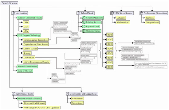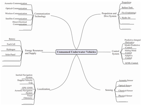 Unmanned underwater vehicles (UUVs) are becoming increasingly important for a variety of applications, including ocean exploration, mine detection, and military surveillance. This paper aims to provide a comprehensive examination of the technologies that enable the operation of UUVs. We begin by introducing various types of unmanned vehicles capable of functioning in diverse environments. Subsequently, we delve into the underlying technologies necessary for unmanned vehicles operating in underwater environments. These technologies encompass communication, propulsion, dive systems, control systems, sensing, localization, energy resources, and supply. We also address general technical approaches and research contributions within this domain. Furthermore, we present a comprehensive overview of related work, survey methodologies employed, research inquiries, statistical trends, relevant keywords, and supporting articles that substantiate both broad and specific assertions. Expanding on this, we provide a detailed and coherent explanation of the operational framework of UUVs and their corresponding supporting technologies, with an emphasis on technical descriptions. We then evaluate the existing gaps in the performance of supporting technologies and explore the recent challenges associated with implementing the Thorp model for the distribution of shared resources, specifically in communication and energy domains. We also address the joint design of operations involving unmanned surface vehicles (USVs), unmanned aerial vehicles (UAVs), and UUVs, which necessitate collaborative research endeavors to accomplish mission objectives. This analysis highlights the need for future research efforts in these areas. Finally, we outline several critical research questions that warrant exploration in future studies. Full article