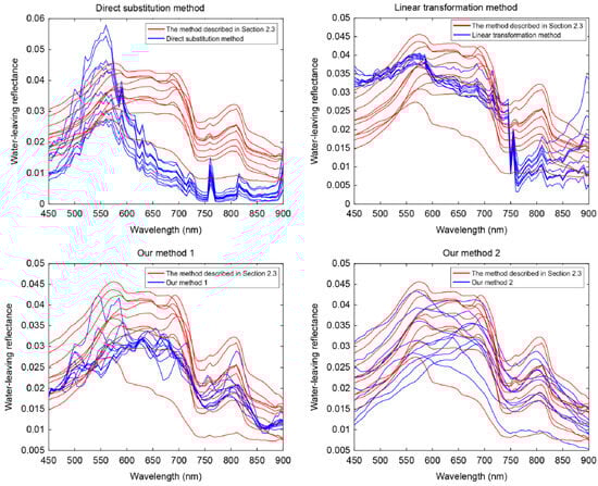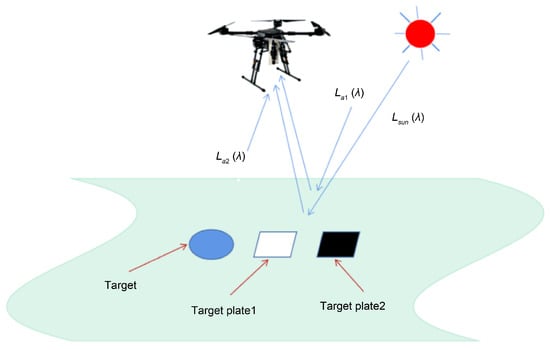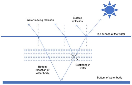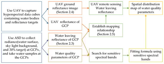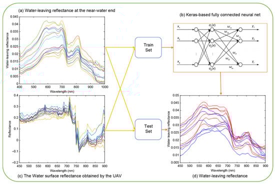 Unmanned aerial vehicle (UAV) hyperspectral remote sensing imaging systems have demonstrated significant potential for water quality monitoring. However, accurately obtaining water-leaving reflectance from UAV imagery remains challenging due to complex atmospheric radiation transmission above water bodies. This study proposes a method for water-leaving reflectance inversion based on air–ground collaborative correction. A fully connected neural network model was developed using TensorFlow Keras to establish a non-linear mapping between UAV hyperspectral reflectance and the measured near-water and water-leaving reflectance from ground-based spectral. This approach addresses the limitations of traditional linear correction methods by enabling spatiotemporal synchronization correction of UAV remote sensing images with ground observations, thereby minimizing atmospheric interference and sensor differences on signal transmission. The retrieved water-leaving reflectance closely matched measured data within the 450–900 nm band, with the average spectral angle mapping reduced from 0.5433 to 0.1070 compared to existing techniques. Moreover, the water quality parameter inversion models for turbidity, color, total nitrogen, and total phosphorus achieved high determination coefficients (R2 = 0.94, 0.93, 0.88, and 0.85, respectively). The spatial distribution maps of water quality parameters were consistent with in situ measurements. Overall, this UAV hyperspectral remote sensing method, enhanced by air–ground collaborative correction, offers a reliable approach for UAV hyperspectral water quality remote sensing and promotes the advancement of stereoscopic water environment monitoring. Full article