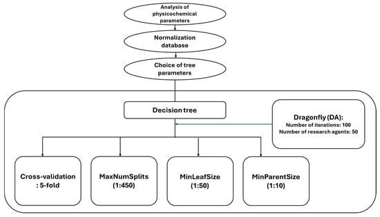 Total alkalinity (TAC) plays a pivotal role in buffering acid–base fluctuations and maintaining pH stability in aquatic ecosystems. This study presents a data-driven approach to model TAC using decision tree regression, applied to a comprehensive dataset of 454 water samples collected in diverse aquatic environments of the Médéa region, Algeria. Twenty physicochemical parameters, including concentrations of bicarbonates, hardness, major ions, and trace elements, were analyzed as input features. The decision tree algorithm was optimized using the Dragonfly metaheuristic algorithm coupled with 5-fold cross-validation. The optimized model (DT_DA) demonstrated exceptional predictive performance, with a correlation coefficient R of 0.9999, and low prediction errors (RMSE = 0.3957, MAE = 0.3572, and MAPE = 0.4531). External validation on an independent dataset of 68 samples confirmed the model’s robustness (R = 0.9999; RMSE = 0.4223; MAE = 0.3871, and MAPE = 0.4931). The tree structure revealed that total hardness (threshold: 78.5 °F) and bicarbonate concentration (threshold: 421.68 mg/L) were the most influential variables in TAC determination. The model offers not only accurate predictions but also interpretable decision rules, allowing the identification of critical physicochemical thresholds that govern alkalinity. These findings provide a valuable tool for anticipating pH instability and guiding water quality management and protection strategies in freshwater ecosystems. Full article