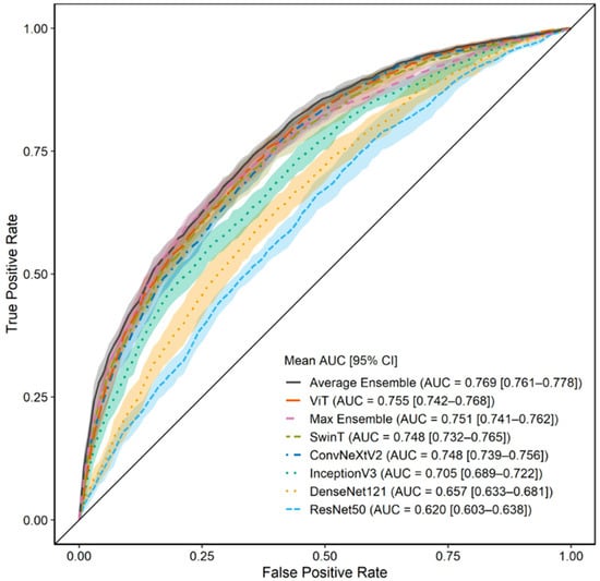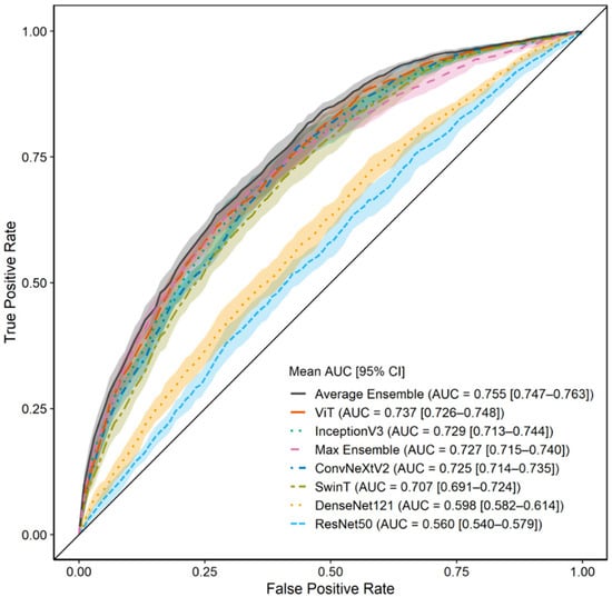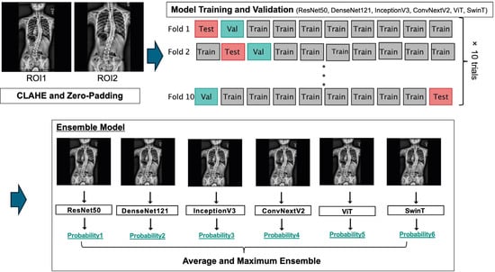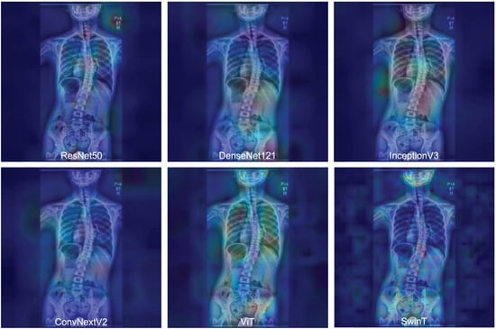 Background/Objectives: The clinical management of adolescent idiopathic scoliosis (AIS) is hindered by the inability to accurately predict curve progression. Although skeletal maturity and the initial Cobb angle are established predictors of progression, their combined predictive accuracy remains limited. This study aimed to develop a robust and interpretable artificial intelligence (AI) system using deep learning (DL) models to predict the progression of scoliosis using only standing frontal radiographs. Methods: We conducted a multicenter study involving 542 patients with AIS. After excluding 52 borderline progression cases (6–9° progression in the Cobb angle), 294 and 196 patients were assigned to progression (≥10° increase) and non-progression (≤5° increase) groups, respectively, considering a 2-year follow-up. Frontal whole spinal radiographs were preprocessed using histogram equalization and divided into two regions of interest (ROIs) (ROI 1, skull base–femoral head; ROI 2, C7–iliac crest). Six pretrained DL models, including convolutional neural networks (CNNs) and transformer-based models, were trained on the radiograph images. Gradient-weighted class activation mapping (Grad-CAM) was further performed for model interpretation. Results: Ensemble models outperformed individual ones, with the average ensemble model achieving area under the curve (AUC) values of 0.769 for ROI 1 and 0.755 for ROI 2. Grad-CAM revealed that the CNNs tended to focus on the local curve apex, whereas the transformer-based models demonstrated global attention across the spine, ribs, and pelvis. Models trained on ROI 2 performed comparably with respect to those using ROI 1, supporting the feasibility of image standardization without a loss of accuracy. Conclusions: This study establishes the clinical potential of transformer-based DL models for predicting the progression of scoliosis using only plain radiographs. Our multicenter approach, high AUC values, and interpretable architectures support the integration of AI into clinical decision-making for the early treatment of AIS. Full article