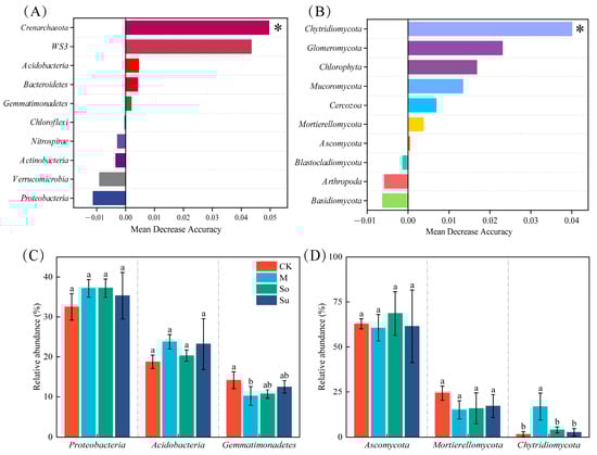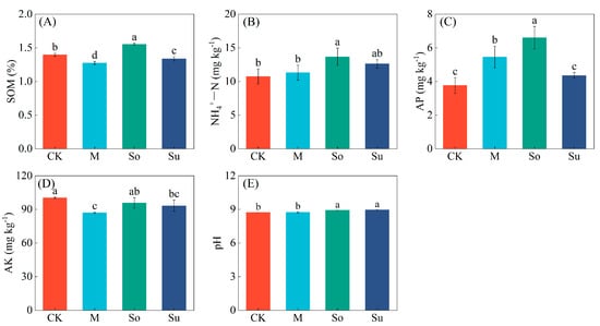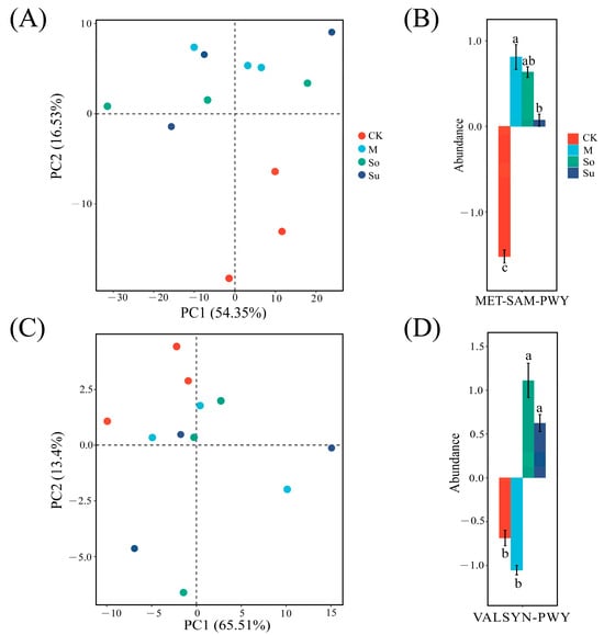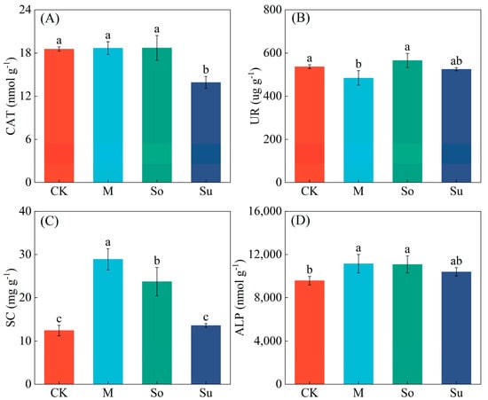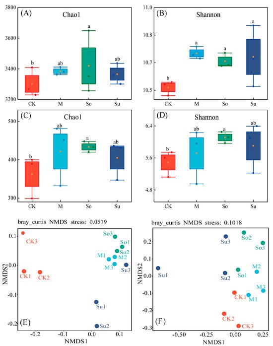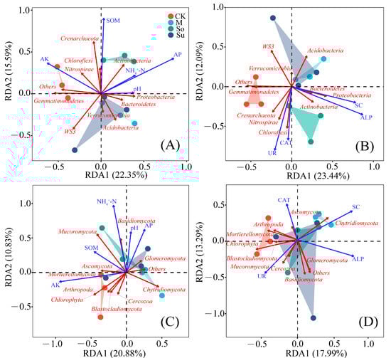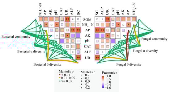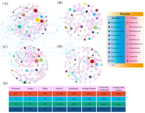 To avoid continuous cropping problems with Bupleurum, we screened suitable preceding crops for rotation with Bupleurum through different crop rotations. Therefore, the objective of this study was to find out the relationships between microbial community characteristics, soil properties, and enzyme activities under four different rotation patterns, including fallow-Bupleurum (CK), maize-Bupleurum (M), soybean-Bupleurum (So), and sunflower-Bupleurum (Su). Results indicated that under all four rotation patterns, So treatment significantly enhanced soil nutrients and enzyme activities compared to CK. So not only optimized the composition of soil bacterial and fungal communities but markedly enhanced microbial α diversity. Additionally, So exhibited high similarity in bacterial and fungal community composition with M, and featured complex symbiotic relationships within the soil microbial network. While no clear discrepancies were detected in the abundance of the top twenty metabolic pathways in the predictive functions of bacterial and fungal communities across four rotation patterns, the metabolic pathway function MET-SAM-PWY (methionine synthesis pathway) in bacterial communities and the metabolic pathway function VALSYN-PWY (valine synthesis pathway) in fungal communities were particularly prominent under the So rotation pattern. RDA suggested that soil properties (available phosphorus and pH) and enzyme activities (sucrase and alkaline phosphatase activities) were the driving forces for bacterial community composition, while soil properties (soil organic matter and available potassium) and enzyme activities (sucrase and catalase activities) regulated fungal community composition. Hence, the soybean-Bupleurum rotation pattern represents a cultivation practice more beneficial for the sustainable development of the bupleurum industry, which can significantly improve soil fertility and the micro-ecological environment. Full article
