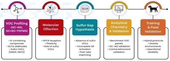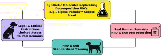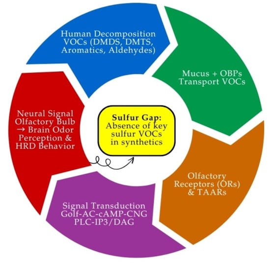 Human remains detection (HRD) dogs are vital tools in forensic science and disaster response, but their training is limited by the restricted availability of human material. Synthetic odorants such as Sigma Pseudo™ formulations provide safer, standardized alternatives, yet current products reproduce only a fraction of the volatile organic compound (VOC) profile of decomposition. In particular, sulfur-containing volatiles, which are highly odor-active and consistently present in human remains, are often missing, reducing biological fidelity. Here, we integrate analytical chemistry with canine olfactory genetics and molecular biology to explain these limitations. Dogs possess one of the largest olfactory receptor (OR) repertoires among mammals, with high allelic diversity and specialized trace amine-associated receptors (TAARs) tuned to cadaveric amines. Together with olfactory binding proteins (OBPs) and ciliary signal transduction cascades, these molecular mechanisms highlight why incomplete VOC mixtures may fail to activate the full receptor network required for reliable odor imprinting. We propose the “sulfur gap hypothesis” and suggest hybrid training strategies combining improved synthetics with ethically sourced biological samples to enhance HRD dog performance. Full article