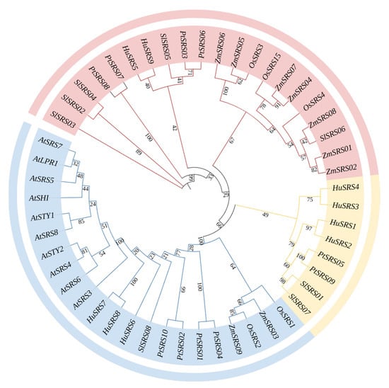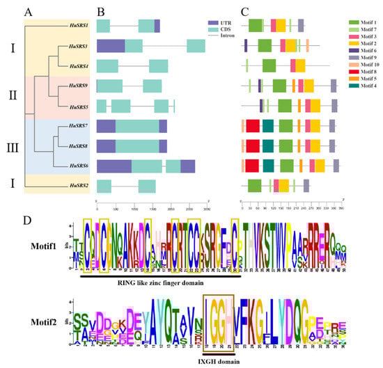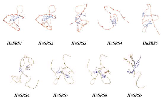 SHORT INTERNODE (SHI)-Related Sequence (SRS) transcription factors play crucial roles in plant growth, development, and stress responses and have been extensively studied in various plant species. However, the molecular functions and regulatory mechanisms of SRS genes in the economically important tropical fruit crop pitaya (Hylocereus undatus) remain poorly understood. This study identified 9 HuSRS genes in pitaya via bioinformatics analysis, with subcellular localization predicting nuclear distributions for all. Gene structure analysis showed 1–4 exons, and conserved motifs (RING-type zinc finger and IXGH domains) were shared across subclasses. Phylogenetic analysis classified the HuSRS genes into three subfamilies. Subfamily I (HuSRS1HuSRS4) is closely related to poplar and tomato homologs and subfamily III (HuSRS6HuSRS8) contains a recently duplicated paralogous pair (HuSRS7/HuSRS8) and shows affinity to rice SRS genes. Protein structure prediction revealed dominance of random coils, α-helices, and extended strands, with spatial similarity correlating to subfamily classification. Interaction networks showed HuSRS1, HuSRS2, HuSRS7 and HuSRS8 interact with functional proteins in transcription and hormone signaling. Promoter analysis identified abundant light/hormone/stress-responsive elements, with HuSRS5 harboring the most motifs. Transcriptome and qPCR analyses revealed spatiotemporal expression patterns: HuSRS4, HuSRS5, and HuSRS7 exhibited significantly higher expression levels in callus (WG), which may be associated with dedifferentiation capacity. In seedlings, HuSRS9 exhibited extremely high transcriptional accumulation in stem segments, while HuSRS1, HuSRS5, HuSRS7 and HuSRS8 were highly active in cotyledons. This study systematically analyzed the characteristics of the SRS gene family in pitaya, revealing its evolutionary conservation and spatio-temporal expression differences. The research results have laid a foundation for in-depth exploration of the function of the SRS gene in the tissue culture and molecular breeding of pitaya. Full article