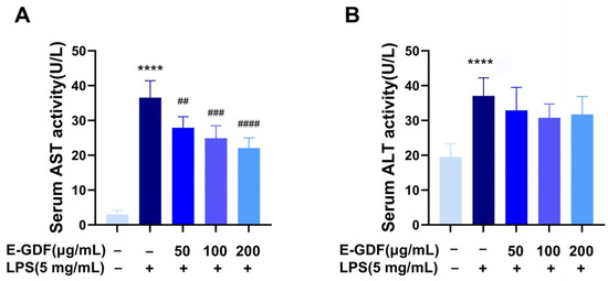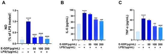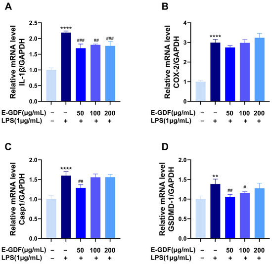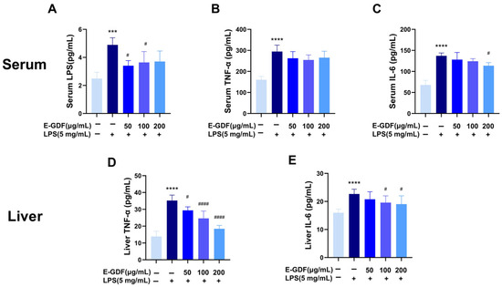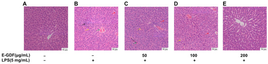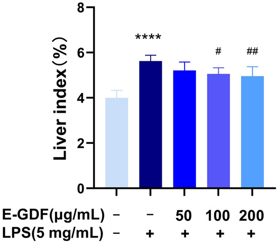 The main objective of this study was to preliminarily analyze the major flavonoid and phenolic acid components of the ethanolic extract of Gerbera delavayi Franch (E-GDF), and to evaluate its anti-inflammatory and antioxidant properties in lipopolysaccharide (LPS)-stimulated murine macrophage RAW264.7 cells and systemic inflammation mouse models. Results indicated that E-GDF was rich in flavonoids (16.35 ± 0.19 mg RT/g d.w. Plant Material) and polyphenolic compounds (36.15 ± 0.20 mg GAE/g d.w. Plant Material). LC-MS analysis of E-GDF revealed that its major flavonoid components included kaempferol glycosides, luteolin, and their glycosylated derivatives, while its phenolic acids were predominantly chlorogenic acid, caffeic acid, ferulic acid, and their corresponding glycosides. E-GDF exhibited good antioxidant activities, including the scavenging of DPPH, ABTS, OH, and O2•− radicals. E-GDF treatment significantly inhibited the production of ROS and inflammatory mediators (NO, IL-6, TNF-α) in LPS-stimulated macrophages (RAW 264.7), while concurrently down-regulating the mRNA expression of COX-2, IL-1β, Casp1, and GSDMD-1. In addition, in vivo experiments revealed that E-GDF treatment effectively reduced the serum LPS, AST levels, as well as hepatic TNF-α, IL-6 levels in mice with LPS-induced acute liver injury. Furthermore, E-GDF significantly ameliorated LPS-induced liver pathological damage. These results provide a basis for G. delavayi as a potential antioxidant, anti-inflammatory, and hepatoprotective herbal medicine. Full article