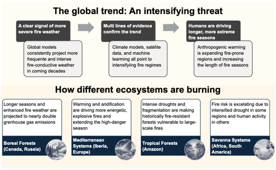 Wildfire regimes are undergoing rapid transformation under anthropogenic climate change, with major implications for biodiversity, carbon cycling, and ecosystem resilience. This systematic review synthesizes findings from 42 studies across global, continental, and regional scales to assess emerging patterns in fire frequency, intensity, and seasonality, and to identify climatic, ecological, and anthropogenic drivers shaping these changes. Across biomes, evidence shows increasingly fire-conducive conditions driven by rising temperatures, vapor-pressure deficit, and intensifying drought, with climate model projections indicating amplification of extreme fire weather this century. Boreal ecosystems show heightened fire danger and carbon-cycle vulnerability; Mediterranean and Iberian regions face extended fire seasons and faster spread rates; tropical forests, particularly the Amazon, are shifting toward more flammable states due to drought–fragmentation interactions; and savannas display divergent moisture- and fuel-limited dynamics influenced by climate and land use. These results highlight the emergence of biome-specific fire–climate–fuel feedback that may push certain ecosystems toward alternative stable states. The review underscores the need for improved attribution frameworks, integration of fire–vegetation–carbon feedback into Earth system models, and development of adaptive, regionally tailored fire-management strategies. Full article