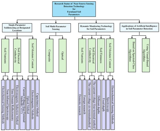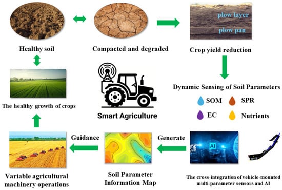 Arable land quality is of the essence for the sustenance of grain production and food security. The continuous monitoring of the physical and chemical properties of arable land is instrumental in facilitating a comprehensive understanding of the evolution patterns of soil quality. This, in turn, provides fundamental evidence that is crucial for the optimization of cultivation practices, the establishment of appropriate plough layers, and the enhancement of soil quality. The near-surface sensing methodologies facilitate the acquisition of soil data at reduced scales, thus signifying a pivotal research trajectory for the procurement of soil-related information. The present study undertakes an examination of the current state of research on acquiring key parameters of farmland soil and provides an overview of the fundamental ground-level techniques employed for the assessment of farmland soil parameters. These techniques encompass single-parameter fixed-point detection, encompassing Soil Moisture Content (SMC), Soil Electrical Conductivity (EC), and nutrient analysis, multi-parameter fusion detection, and dynamic parameter monitoring. The study systematically reviews field sensing methods for major soil physicochemical parameters (such as SMC, Soil Penetration Resistance (SPR), EC, and nutrients) while analyzing the current application of Artificial Intelligence (AI) in soil parameter detection. The present paper proposes a developmental trajectory that shifts from “single-parameter static” to “multi-parameter dynamic” monitoring. This trajectory is proposed as a building upon the analysis of existing research. This evolution emphasizes intelligent algorithm-driven data enhancement to improve detection accuracy, forming a closed-loop progression of “dynamic detection—precise modeling—decision support”. This framework provides a reference for the advancement of soil sensing monitoring technologies and the scaling of precision agriculture applications. Full article