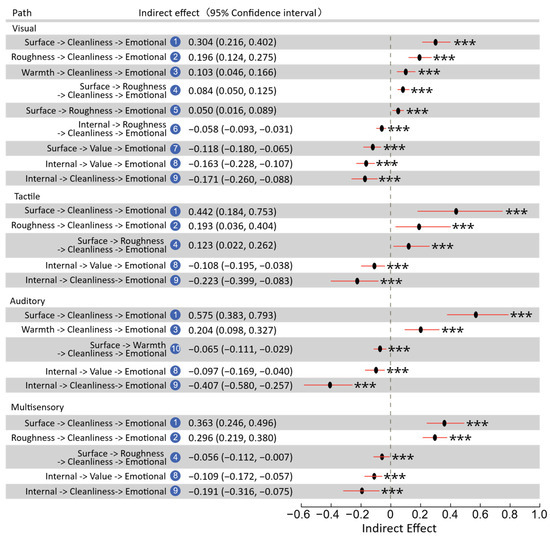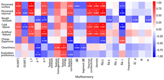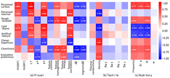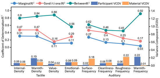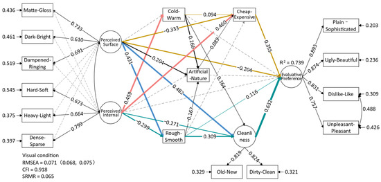 The selection of building materials increasingly prioritizes aesthetic and comfort-related experiences, yet the perceptual pathways linking physical properties to emotional judgments remain underexplored, particularly among Chinese users. This study aimed to clarify how different sensory modalities contribute to the perceptual pathways linking physical properties of wood to emotional judgments under multisensory conditions. Sixty young Chinese adults evaluated wood samples under visual, tactile, auditory, and multisensory conditions. Multivariate modeling approaches were applied to identify perceptual structures, mediating pathways to aesthetic judgments, and associations between subjective impressions and physical parameters. A three-factor perceptual structure was identified, comprising surface qualities, internal qualities, and emotional judgment. Path analyses showed that perceived cleanliness acted as the primary mediator from low-level perceptions to emotional responses, whereas naturalness played a limited role. Multisensory integration was vision-dominant (relative sensory weights from Bayesian weighted regression > 0.50), with touch providing secondary contributions (weights > 0.30) and audition exerting minimal influence. Lightness strongly predicted surface qualities, while density predicted internal qualities, with both achieving conditional and marginal R2 values above 0.50. In contrast, higher-order impressions showed strong between-group but weak individual-level explanatory power (marginal R2 < 0.30), indicating that physical parameters capture group-level tendencies but offer limited precision for individual emotional responses. These results inform culturally sensitive, multisensory design strategies for wood in biophilic and human-oriented environments and highlight the need to incorporate non-physical factors for precise personalization. Full article