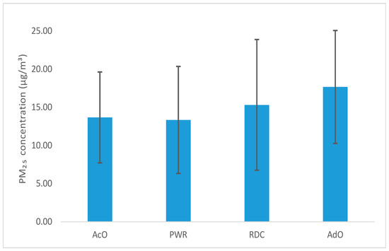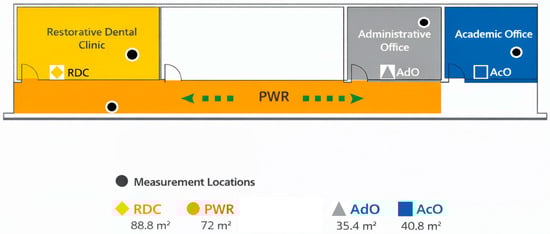 Indoor air quality (IAQ) in healthcare facilities is increasingly recognized as a key determinant of occupant health, comfort, and operational performance. Owing to heterogeneous space functions, varying occupancy patterns, and dynamic operational conditions, IAQ parameters may exhibit marked spatial and temporal variability within the same facility. University-affiliated healthcare buildings, where clinical services coexist with academic and administrative activities, represent particularly complex indoor environments that remain relatively underexplored in the current IAQ literature. This study examines the spatiotemporal variability of indoor carbon dioxide (CO2) and fine particulate matter (PM2.5) concentrations across four representative functional zones within a university-affiliated healthcare facility, including a patient waiting room, an academic office, an administrative office, and a restorative dental clinic. Continuous, long-term monitoring was conducted over a multi-month period to capture both spatial differences and diurnal dynamics under real operational conditions. Daily mean CO2 concentrations varied across functional zones, ranging from approximately 540 to 620 ppm, with higher levels generally observed in spaces with sustained occupancy and limited ventilation. Daily mean PM2.5 concentrations ranged from approximately 13 to 18 µg/m3, with greater variability detected in zones associated with intermittent activities and procedural sources. Unlike many IAQ studies focusing on single departments or short-term campaigns, this multi-zone, long-term assessment within a shared building infrastructure enables direct comparison of functional spaces and identification of time-specific exposure patterns. Overall, the findings highlight that IAQ conditions within healthcare facilities are shaped by both space function and temporal factors, even under shared ventilation infrastructure. The results emphasize the value of zone-specific and time-resolved IAQ assessment approaches and provide evidence-based insights to support targeted ventilation strategies, activity-aware operational controls, and improved indoor environmental management in healthcare settings. Full article