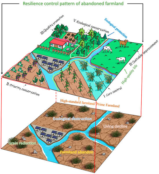 Farmland quantity continues to decline, land abandonment is a serious concern, and local quality degradation remains unresolved. This situation, in which large-scale farmland abandonment continues, is likely to induce a series of food security and ecological protection problems. However, strengthening the protection and development of abandoned farmland (AF) is very difficult. In response to this issue, this paper provides a comprehensive review and synthesis of domestic and international research on AF. The results show that the prior research has largely focused on information acquisition and the analysis of driving factors, while relatively limited attention has been given to pathways for the reuse and management of AF, with few relevant studies and practical examples available. In addition, no clear theoretical framework has been developed to evaluate and manage the multiple elements of and the overall process leading to AF. Building on an examination of the feasibility of applying resilience theory to the management of AF, this paper defines the conceptual scope and core meaning of AF resilience management and constructs a resilience management implementation path based on the steps of objective determination, problem profiling, evaluation feedback, and scheme formulation. This framework helps reveal the structure–process–function evolutionary characteristics of AF across different development stages and provides analytical support for the design of differentiated and adaptable management strategies. Full article