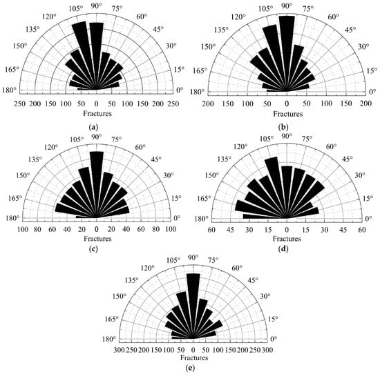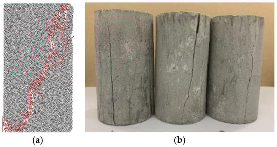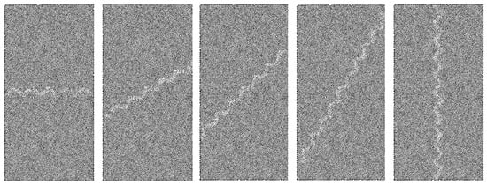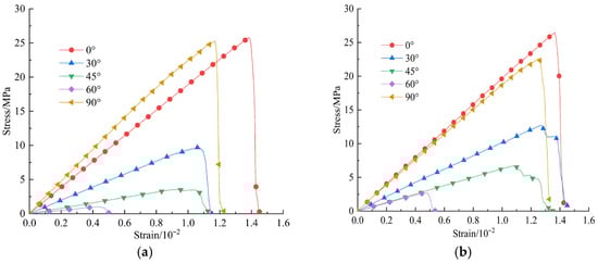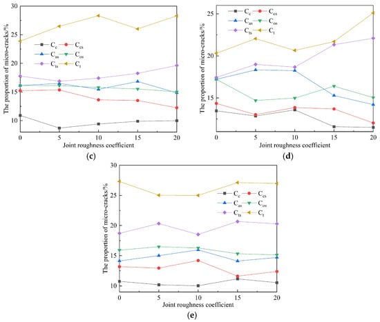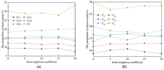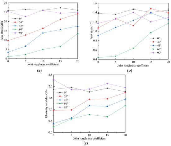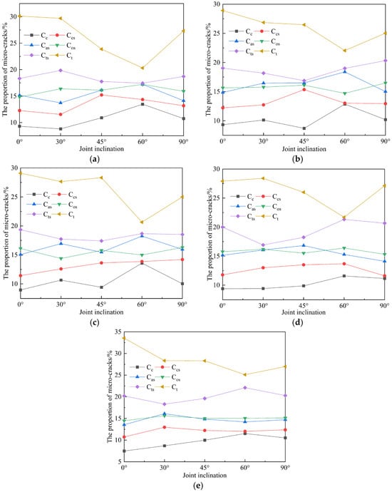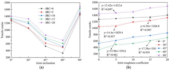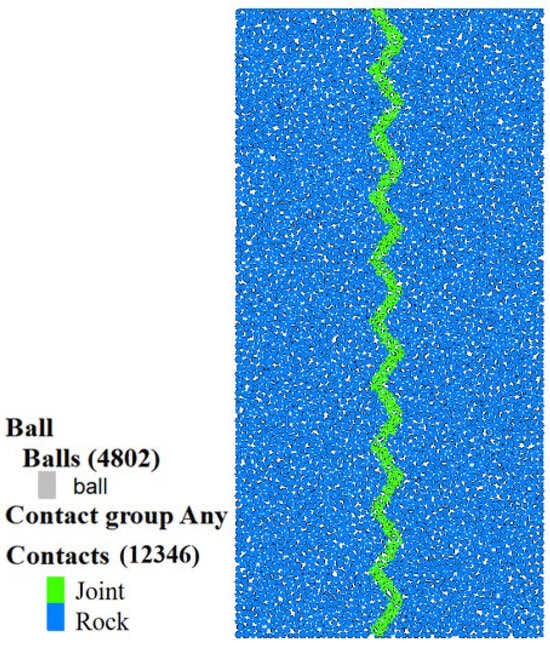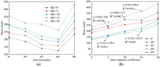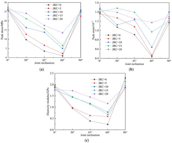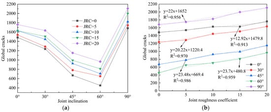 Joint roughness coefficient (JRC) and inclination exert a decisive influence on the stability and safety of rock mass engineering. Simulations of uniaxial compression were conducted on saw-tooth-shaped joint specimens using a calibrated particle flow (PFC2D) model. The specimens contained five JRC values (0, 5, 10, 15, 20) and five joint inclinations (0°, 30°, 45°, 60°, 90°). The results indicate that at joint inclinations of 0° and 90°, JRC has a marginal influence on peak stress and elastic modulus. In contrast, as the inclination increases, the peak stress, peak strain, and elastic modulus collectively exhibit an approximate V-shaped trend. The dominant failure mode observed was a mixed splitting-shear mechanism. The number of cracks at final failure increases with higher JRC values under the same joint inclination. As the joint inclination varied, the distributions of global, tensile, and shear cracks all exhibited similar V-shaped trends. Concurrently, the proportions of different microcrack types demonstrated relative stability throughout the failure process, with tensile and shear failures constituting the dominant microscopic mechanisms. Full article