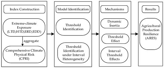 Against the backdrop of accelerating climate change, extreme weather events have increasingly caused yield losses in agricultural crops. Meanwhile, they undermine the stability of production systems, posing an increasingly severe threat to agriculture. This study draws on the “diversity–stability” hypothesis to construct a country-level measure of agricultural production resilience in China (ARES). Using output time series for multiple agricultural products, we capture the co-movements of shocks and system resilience through output stability and volatility. By combining ARES with climate exposure measures, we assemble a panel dataset covering 1343 counties over the period 2000–2023 and employ a dynamic panel threshold model to jointly account for persistence in ARES and state-dependent nonlinearities in climate impacts. The results reveal significant path dependence in ARES and pronounced threshold effects across climate dimensions. In the full sample, extreme high-temperature days become significantly detrimental after crossing the threshold, whereas extreme low-temperature days become significantly beneficial in the high-exposure regime. Extreme rainfall days and extreme drought days generally exhibit positive effects that weaken markedly beyond their respective thresholds, indicating diminishing marginal gains in ARES under severe exposure. The comprehensive climate physical risk index significantly suppresses ARES when it is below the threshold value; however, after surpassing the threshold, its marginal effect becomes significantly weaker. Heterogeneity analyses across hilly, plain, and mountainous areas, as well as nationally designated key counties for poverty alleviation and development, further show that threshold locations and regime-specific effects differ substantially by terrain and development conditions. These findings highlight the need for “threshold-based” climate adaptation governance, emphasizing targeted investments and risk-financing instruments to prevent ARES collapse under tail-risk regimes. Full article