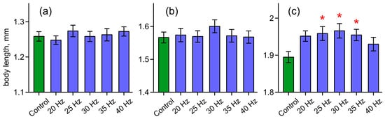 The biological effects of weak low-frequency magnetic fields (LFMFs) remain controversial, particularly regarding frequency-specific resonance-like responses. Many previous studies tested different frequencies sequentially, potentially introducing uncontrolled environmental variability. This study aimed to evaluate frequency-dependent effects of LFMFs on the growth of juvenile Daphnia magna under strictly synchronized and temperature-controlled conditions. Genetically identical neonates from a single parthenogenetic brood were simultaneously exposed to sinusoidal 50 μT magnetic fields at 20, 25, 30, 35, or 40 Hz using spatially separated Helmholtz coils integrated into a closed-loop thermal stabilization system. Body length was measured after 48, 96, and 144 h of exposure. No significant growth differences were detected after 48 h. After 96 h, a significant biological effect was observed only at 30 Hz. The most pronounced responses occurred after 144 h, with significant growth stimulation at 25, 30, and 35 Hz and a maximal effect at 30 Hz. The frequency–response relationship exhibited a dome-shaped pattern that became less sharply peaked with prolonged exposure. These findings demonstrate duration-dependent and frequency-specific stimulation of juvenile daphnid growth with weak LFMFs. It suggests that exposure time critically influences the manifestation and breadth of resonance-like magnetobiological effects. Full article