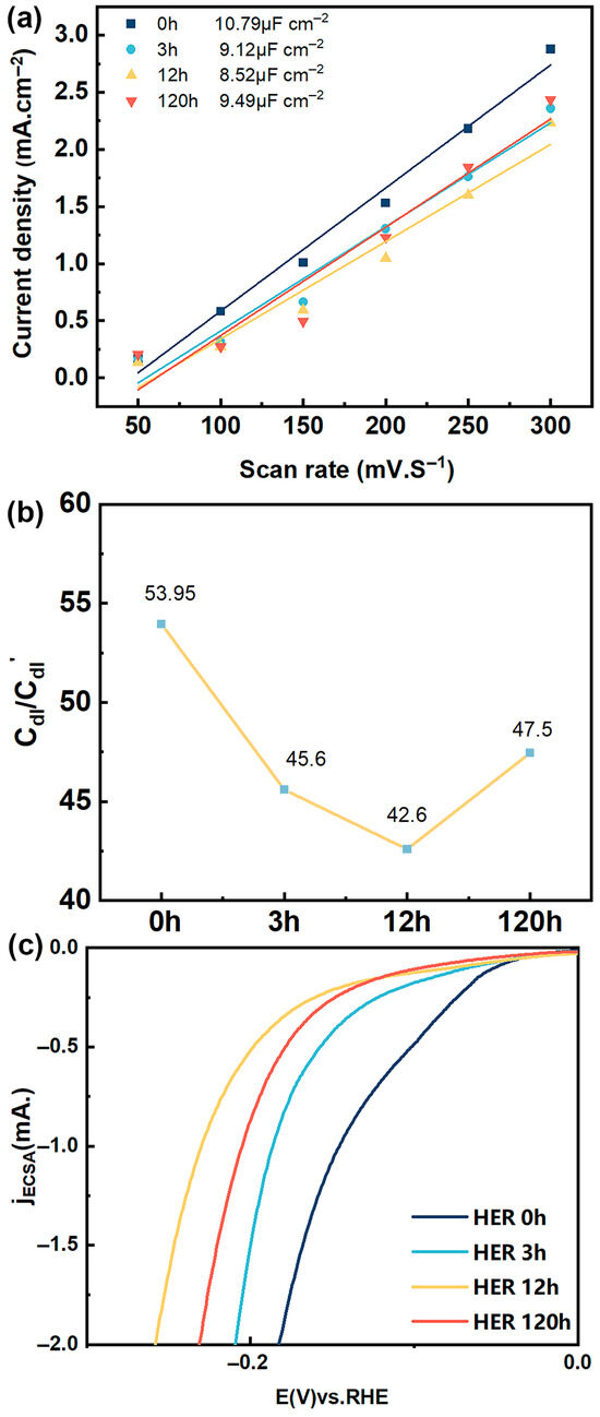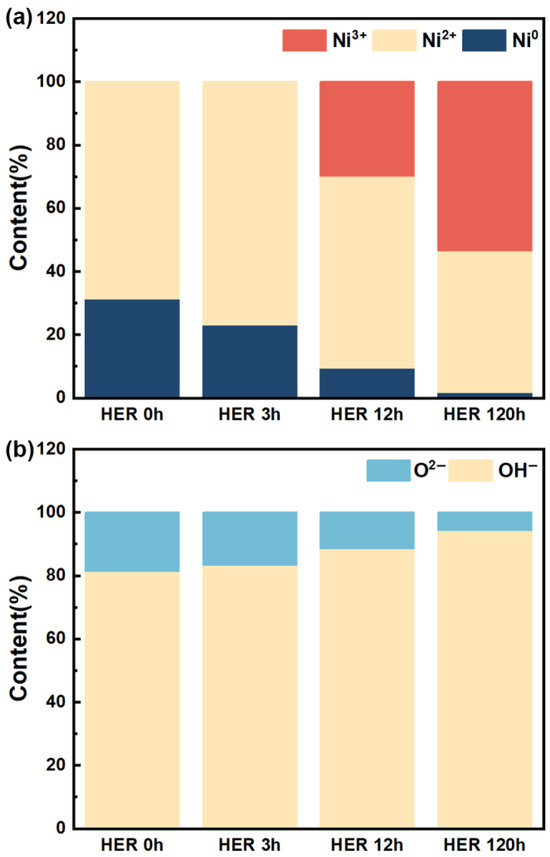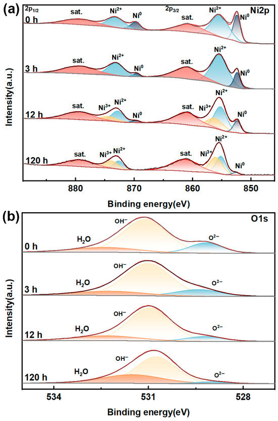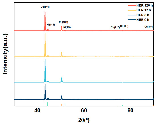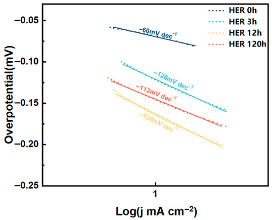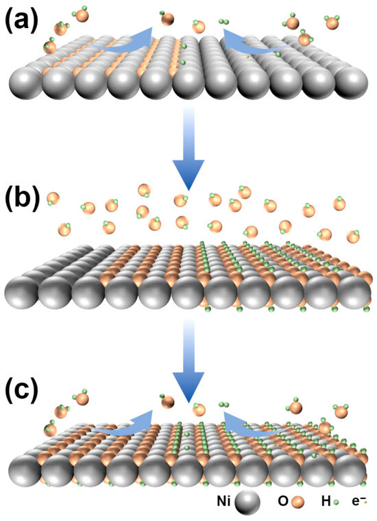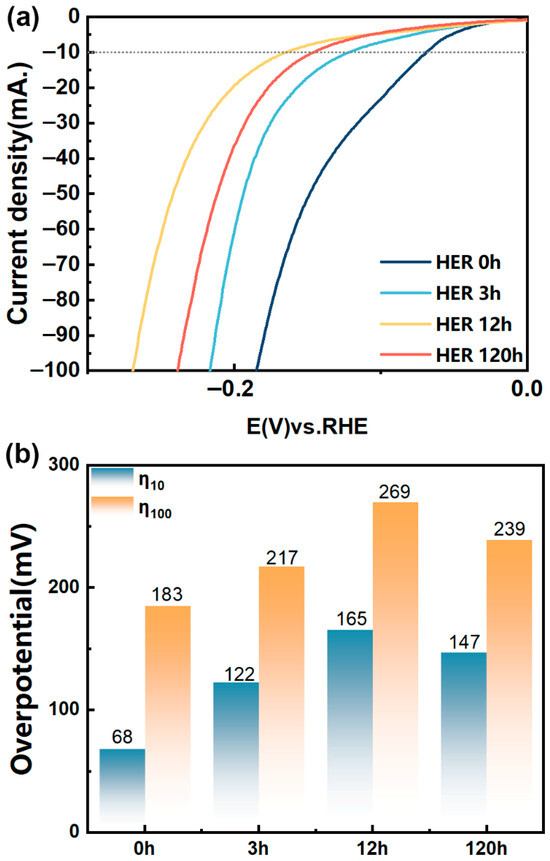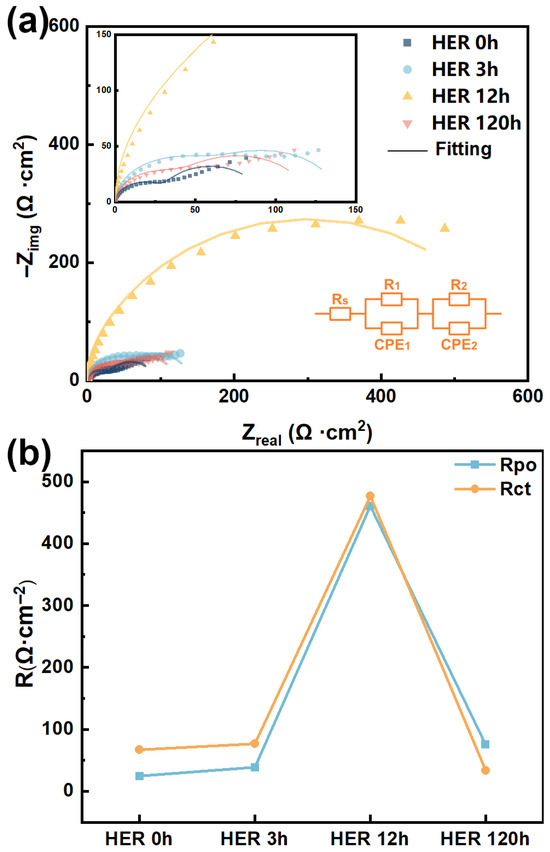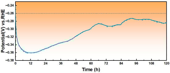 Despite the long-standing recognition of nickel as an effective electrocatalyst for the alkaline hydrogen evolution reaction (HER), the majority of extant studies primarily focus on initial catalytic performance or short-term stability under relatively low current densities. In practical alkaline water electrolysis, however, electrodes operate continuously at elevated current densities for extended periods, where surface chemical states and electrochemical responses may evolve dynamically. A systematic understanding of such time-dependent behaviour remains limited, particularly for electrodeposited nickel under sustained operation. In this study, the long-term HER performance of electrodeposited Ni electrodes at a current density of 100 mA cm−2 over 120 h is investigated. The objective of this study is to correlate the evolution of electrochemical performance with changes in surface chemical states during prolonged electrolysis. To this end, a combination of methods was employed, including polarization measurements, electrochemical impedance analysis, double-layer capacitance evaluation, and ex situ surface characterization. In contrast to the tendency to prioritize absolute enhancement of activity, this study places greater emphasis on the transient decline–recovery–stabilization behaviour that is observed during operation. Furthermore, it discusses the potential relationship of this behaviour with surface hydroxylation and restructuring processes. The present study utilizes a time-resolved analysis to elucidate the dynamic surface evolution of nickel electrodes under practical alkaline HER conditions, thereby underscoring the significance of evaluating catalyst durability beyond the confines of short-term measurements. The findings presented herein contribute to a more realistic assessment of nickel-based electrodes for alkaline water electrolysis applications. Full article
