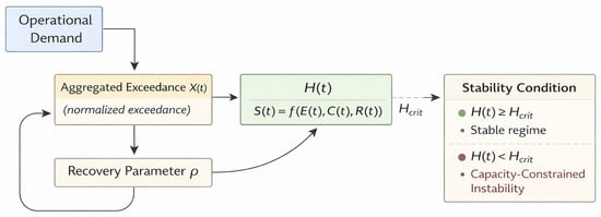 Industrial sustainability is commonly evaluated through environmental impact, resource consumption, and operational resilience indicators. These metrics describe system performance but do not define whether production remains within human physiological limits. This study develops a dynamic capacity-constrained sustainability model that treats human work capacity as a bounded system state rather than a descriptive social variable. The model formulates capacity as a continuous-time variable governed by aggregated exceedance of thermal and physical tolerance limits and by a recovery parameter representing biological restoration. A stability threshold is derived analytically, defining a critical exceedance level above which steady-state capacity declines below the minimum functional requirement for stable operation. Sensitivity analysis demonstrates that equilibrium capacity decreases nonlinearly with increasing exceedance and depends on the recovery rate. A numerical illustration under summer thermal exposure conditions shows that two production configurations with identical environmental and resource indicators may fall on opposite sides of the stability boundary due to differences in aggregated exceedance. The results indicate that sustainability assessment requires integration of measurable physiological constraints. Human work capacity functions as a dynamic boundary condition that conditions system stability beyond conventional environmental performance metrics. Full article
