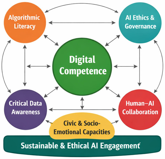 The accelerated expansion of artificial intelligence (AI) is reshaping economic systems, labour markets and democratic life, giving rise to hybrid human–AI societies. In this context, education becomes a strategic arena for enabling sustainable and socially just transitions within the Fourth Industrial Revolution. This article examines how digital competence can be reconceptualized to prepare future citizens and educators for these emerging societal configurations, with particular attention to the Ibero-American context. A conceptual framework is proposed that integrates algorithmic literacy, critical data awareness, AI ethics, human–AI collaboration skills, and civic and socio-emotional capacities as core dimensions of “next-decade” digital competence. Methodologically, the study combines three complementary approaches: (a) a structured review of interdisciplinary literature on AI, digital competence and sustainability; (b) an analysis of international and regional policy documents and competence frameworks relevant to Ibero-America; and (c) selected empirical insights drawn from the first author’s doctoral research on digital competence and AI use in teacher education. The findings reveal significant tensions between rapid AI adoption and persistent structural inequalities in the Global South, while identifying key leverage points for aligning teacher education, public policy and institutional strategies with the Sustainable Development Goals. The proposed framework aims to support policymakers, universities and international organizations in fostering inclusive and sustainable AI-driven social change while mitigating new forms of exclusion and dependency. Full article