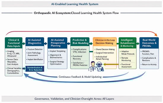 Conclusions: AI is beginning to influence musculoskeletal care, moving beyond pattern recognition toward integrated, patient-centered decision support throughout the perioperative and rehabilitation periods. Its widespread use remains constrained by limited multicenter validation, dataset bias, algorithmic opacity, and immature regulatory and governance frameworks. Future work should prioritize prospective multicenter impact studies, repeatable revalidation of local models, integration of PROM and teleorthopedic data with health learning systems, and adaptation to changing regulatory requirements to enable safe, ethical, effective, and equitable implementation in routine orthopedic practice.