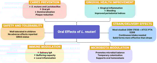 Background: Limosilactobacillus reuteri (L. reuteri), present in the oral and intestinal microbiota, can colonize the oral cavity through breastfeeding and dairy intake, promoting oral health by balancing the microbiota, inhibiting pathogens, and modulating immune responses. This study aimed to evaluate the preventive role and therapeutic potential of L. reuteri in pediatric oral health. Methods: A literature review was conducted using PubMed, Wiley Library, and the Cochrane Library, supplemented by manual screening, according to PRISMA guidelines and covering the period from January 2011 to 31 December 2024. Results: From 835 records identified, 12 studies met the inclusion criteria. Data shows that L. reuteri strains produce antimicrobial substances that disrupt biofilms and inhibit Streptococcus mutans and other lactobacilli, leading to increased oral pH and improved periodontal indices. The effectiveness of probiotics was found to be strain-specific and transient, with continuous intake and adequate oral hygiene enhancing their ability to colonize the oral cavity. Conclusions: Probiotics show significant potential as therapeutic interventions for controlling cariogenic bacteria and supporting gum health in children. Through mechanisms including bacterial co-aggregation, competitive exclusion, antimicrobial compound synthesis, and immune modulation, probiotics may effectively reduce the risk of tooth decay and gum disease. Their effectiveness depends on the strain, regular intake, proper dosing, good oral hygiene, and suitable delivery, which enhance oral colonization and clinical benefits. Full article