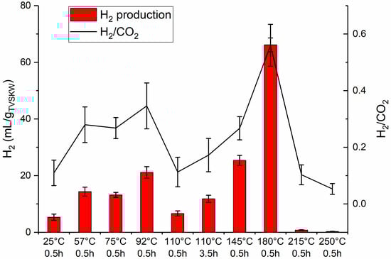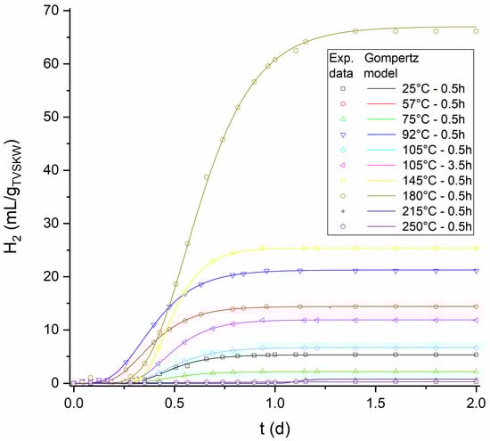 This study presents an innovative approach to the production of hydrogen from liquids following hydrothermal treatment of biowaste, offering a potential solution for renewable energy generation and waste management. By combining biological and hydrothermal processes, the efficiency of H2 production can be significantly improved, contributing to a reduced carbon footprint and lower reliance on fossil fuels. The inoculum used was fermented sludge from a wastewater treatment plant, which had been thermally pretreated to enhance microbial activity towards hydrogen production. Kitchen waste, consisting mainly of plant-derived materials (vegetable matter), was used as a substrate. The process was conducted in batch 1-L bioreactors. The results showed that higher pretreatment temperatures (up to 180 °C) increased the hydrolysis of compounds and enhanced H2 production. However, temperatures above 180 °C resulted in the formation of toxic compounds, such as catechol and hydroquinone, which inhibited H2 production. The highest hydrogen production was achieved at 180 °C (approximately 66 mL H2/gTVSKW). The standard Gompertz model was applied to describe the process kinetics and demonstrated an excellent fit with the experimental data (R2 = 0.99), confirming the model’s suitability for optimizing H2 production. This work highlights the potential of combining hydrothermal and biological processes to contribute to the development of sustainable energy systems within the circular economy. Full article