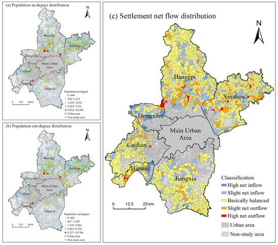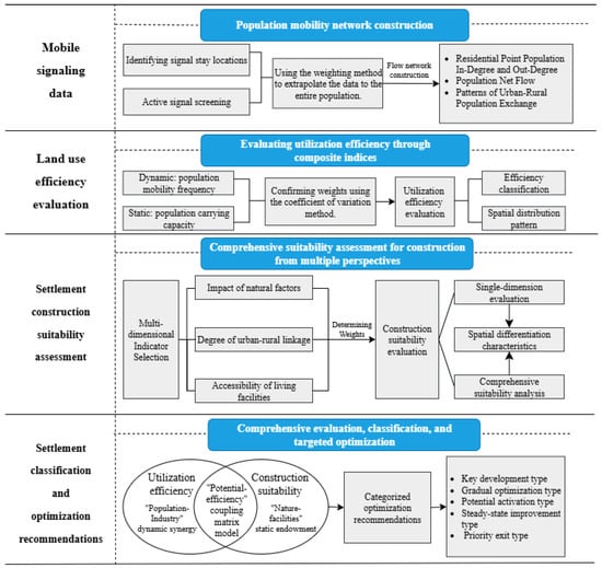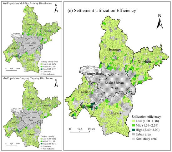 To address the utilization challenges of rural settlements in metropolitan suburbs, this study takes the suburban areas of Wuhan as its research object. Based on mobile signaling data and multi-source geographic data, it evaluates their utilization efficiency and construction suitability from both dynamic and static dimensions, and proposes zoning optimization strategies. The study constructed a population mobility network, revealing that rural population flow in Wuhan radiates primarily from the main urban core, with net inflow or balance prevalent in near-suburban areas and net outflow dominant in distant suburbs. The results indicate that only 11.45% of villages achieve medium-to-high utilization efficiency, while 94.50% of the area is classified as highly suitable for development. Based on the “Efficiency-Potential” matrix, villages are categorized into five types, including key development type, gradual optimization type, potential activation type, steady-state improvement type and priority exit type. This study contributes to our understanding of the relationship between rural population and land, and provides support for the optimization of suburban settlements and rural revitalization. Full article