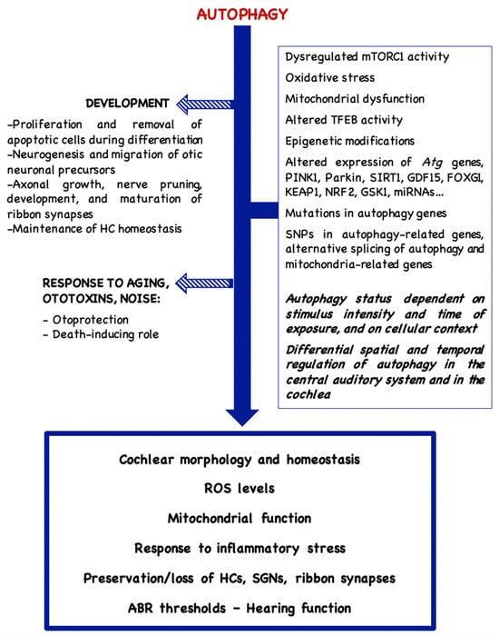 Autophagy plays a key role in the development and homeostasis of the cochlear organ. Alterations in the autophagic pathways have been associated with damage to auditory cell types and hearing impairment caused by an array of factors like age, ototoxicity, exposure to high levels of noise, or genetic mutations. Cochlear damage frequently entails mitochondrial dysfunction, impaired mitophagy and the accumulation of high concentrations of free radicals. This review summarizes the observations made to date on the autophagic function in response to cochlear damage and the results of either activating or inhibiting these processes. The data demonstrate that autophagic activity is cell context-dependent and varies according to the cochlear cell type, the toxic agent, its levels and the length and timing of its administration; other factors that influence the autophagic response may be external to the auditory system or related to epigenetic changes or the expression of genetic variants. Modulation of the autophagic status has an effect on auditory cell loss and the progression to hearing impairment and this approach has thus become a promising avenue towards the protection of the hearing function. Nonetheless, this is no easy task and it will require the identification of reliable biomarkers to evaluate the dynamics of autophagic activity as well as the development of specific autophagy modulators that do not exert toxicity. Full article