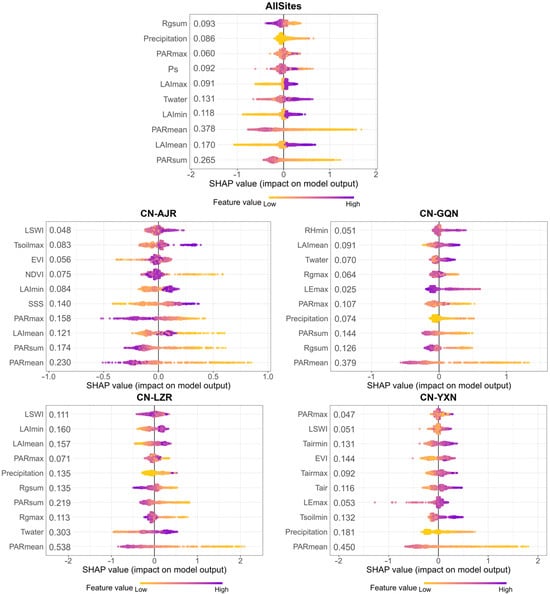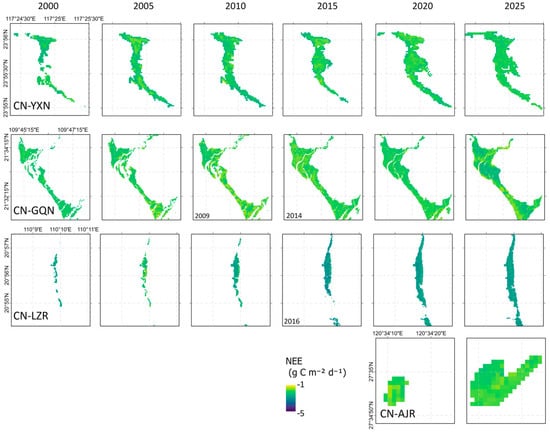 Mangrove ecosystems are important blue carbon systems and play a critical role in understanding carbon cycling and responses to climate change. However, accurate regional estimation of Net Ecosystem Exchange (NEE) remains challenging due to the environmental complexity and spatial heterogeneity. This study combined eddy covariance observations from four mangrove sites along China’s southeastern coast (natural and restored mangrove forests) with multi-source remote sensing and environmental reanalysis data to construct three variable schemes (site observations only, with added vegetation indices, and comprehensive multi-source variables). We compared three machine learning models for daily NEE prediction, including eXtreme Gradient Boosting (XGBoost), Random Forest (RF), and Support Vector Machine (SVM). The results showed that: (1) Restored and natural mangroves exhibited similar temporal NEE dynamics and consistently functioned as carbon sinks, restored mangrove sites showed greater cross-site variability. Among the study sites, CN-LZR exhibited the strongest cumulative carbon uptake. (2) Scheme 3 combined with the XGBoost algorithm achieved the highest predictive accuracy, reaching an R2 of 0.73 across sites. Differences among machine learning models were primarily associated with their ability to capture nonlinear interactions between atmospheric and hydrological variables, with tree-based models outperforming SVM. (3) SHAP analysis indicated that radiation-related variables were the dominant drivers of NEE, while hydrological influences were site-dependent; and (4) Regional upscaling indicated that all sites consistently functioned as long-term carbon sinks, with CN-LZR exhibiting slightly higher daily mean carbon uptake than the other sites. This study presented the first machine learning framework for estimating daily-scale NEE in mangroves, providing methodological and data support for regional carbon flux assessment and blue carbon management. Full article
