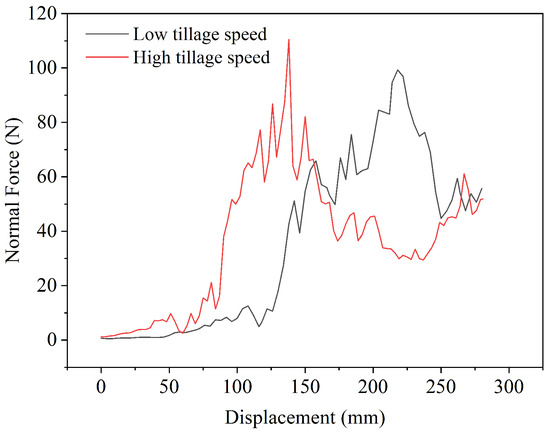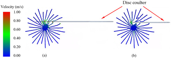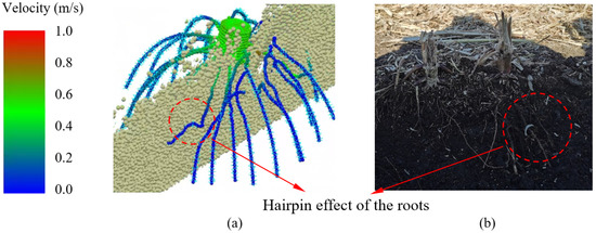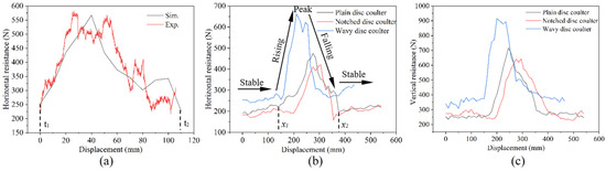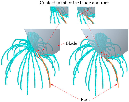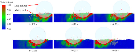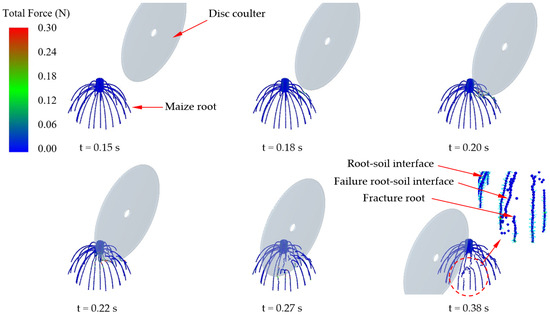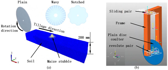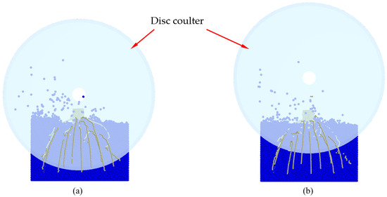 To solve the problems of high resistance and blockage in stubble-breaking operations, it is necessary to reveal the interaction mechanism between disc coulters and crop root–soil composites. This study developed a discrete element method–multi-body dynamics (DEM-MBD) coupling model of the stubble-breaking operation and verified the accuracy of the model through soil bin tests (error < 20%) and field experiments (error < 32%). The model was used to investigate the effects of different design parameters (coulter type and disc radius) and operating parameters (tillage speed and depth) on the stubble-breaking operation. The results showed that due to the significant strengthening effect of roots on soil, the resistance of disc coulter stubble-breaking operation was high; the number of roots in contact with the blade edge and the amount of root deformation significantly affected the resistance of the disc coulter; irreversible deformation of roots and soil could easily lead to the holes and root hairpin effects in the seeding furrow; compared to plain disc coulters, the difference in the time of deformation and fracture of the roots made the resistance of the notched coulter lower. The wavy disc coulter with a longer edge curve made its resistance higher; the disc coulter with a greater radius, higher tillage speed, and deeper tillage depth significantly increased the tillage resistance. However, the disc coulter with a greater radius or a higher tillage speed was beneficial for improving stubble-breaking performance. This study revealed the interaction mechanism between disc coulters and maize root-soil composites, providing a theoretical basis for the optimization design of no-till stubble-breaking devices. Full article