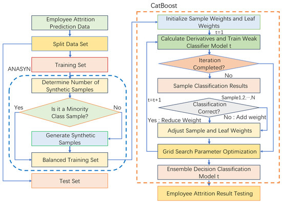 In corporate management practices, human resources are among the most active and critical elements, and frequent employee turnover can impose substantial losses on firms. Accurately predicting employee turnover dynamics and identifying turnover propensity in advance is therefore of significant importance for organizational development. To improve turnover prediction performance, this study proposes an employee turnover prediction model that integrates an improved ADASYN data rebalancing algorithm with a grid-search-optimized CatBoost classifier. In practice, turnover instances typically constitute a minority class; severe class imbalance may lead to overfitting or underfitting and thus degrade predictive performance. To mitigate imbalance, we employ ADASYN oversampling to reduce skewness in the dataset. However, because ADASYN is primarily designed for continuous features, it may generate invalid or meaningless values when discrete variables are present. Accordingly, we improve ADASYN by introducing a new distance metric and an enhanced sample generation strategy, making it applicable to turnover data with mixed (continuous and discrete) features. Given CatBoost’s strong predictive capability in high-dimensional settings, we adopt CatBoost as the base learner. Nonetheless, CatBoost performance is highly sensitive to hyperparameter choices, and different parameter combinations can yield markedly different results. Therefore, we apply grid search (GS) to efficiently optimize CatBoost hyperparameters and obtain the best-performing configuration. Experimental results on three datasets demonstrate that the proposed improved-ADASYN GS-CatBoost model effectively enhances turnover prediction performance, exhibiting strong robustness and adaptability. Compared with existing models, our approach improves predictive accuracy by approximately 4.6112%. Full article