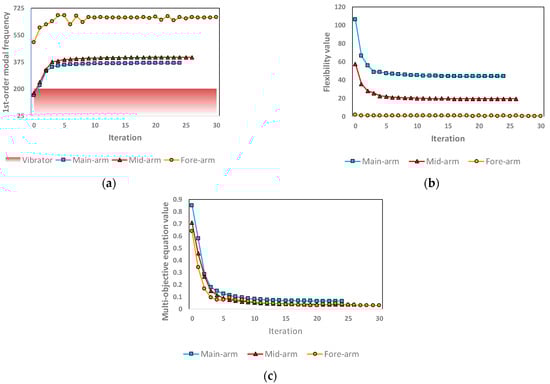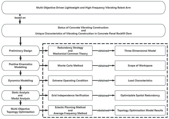 To address the challenges in concrete vibration during the construction of concrete-faced rockfill dams, this study proposes a multi-objective-driven lightweight and high-frequency vibrating robotic arm (VRA). The proposed system aims to improve adaptability and performance under harsh site conditions, such as inclined slab surfaces and confined rebar layouts. Based on the geometric structure and task characteristics of the VRA, a multi-objective topology optimization framework was established, integrating compromise programming and average frequency strategies. This method simultaneously achieves mass reduction, stiffness enhancement, and modal frequency improvement to avoid resonance during high-frequency operations. The workspace of the VRA was verified using kinematic modeling and Monte Carlo sampling, and a critical physical posture—where the arm is fully extended horizontally, producing maximum span and joint loads—was identified to extract dynamic load boundaries. Finite element analysis was then conducted under worst-case conditions, and the optimization results were validated by modal analysis and flexibility metrics. The optimized VRA demonstrated substantial improvements in structural performance, reducing overall mass, lowering flexibility, and increasing modal frequencies. The proposed framework provides a transferable approach for designing high-frequency robotic arms in vibration-intensive scenarios, supporting intelligent construction in concrete-faced rockfill dams and similar complex environments. Full article