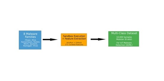 This study introduces a modular, behaviorally curated malware dataset suite consisting of eight independent sets, each specifically designed to represent a single malware class: Trojan, Mirai (botnet), ransomware, rootkit, worm, spyware, keylogger, and virus. In contrast to earlier approaches that aggregate all malware [...] Read more.