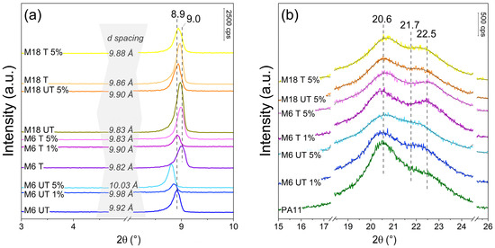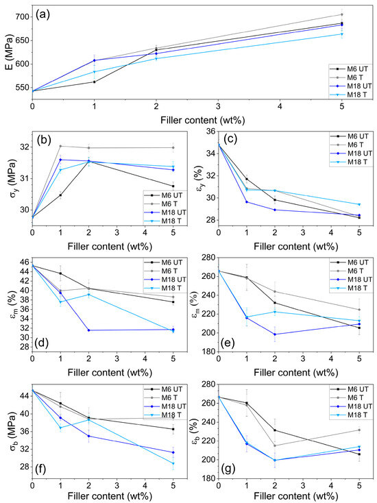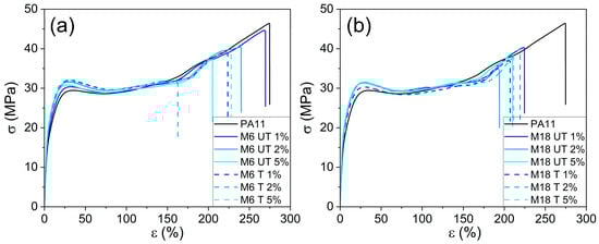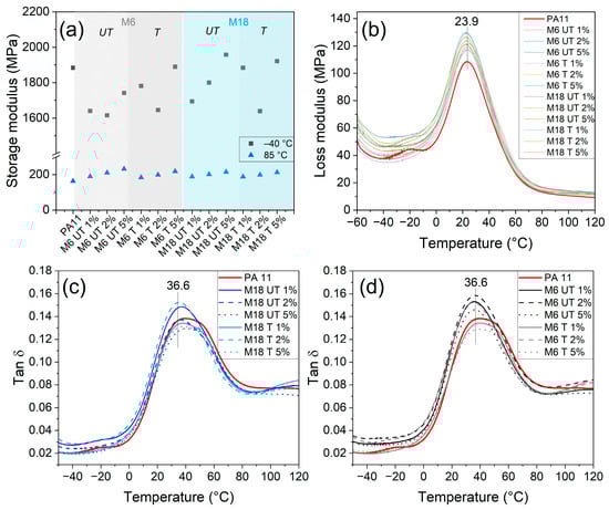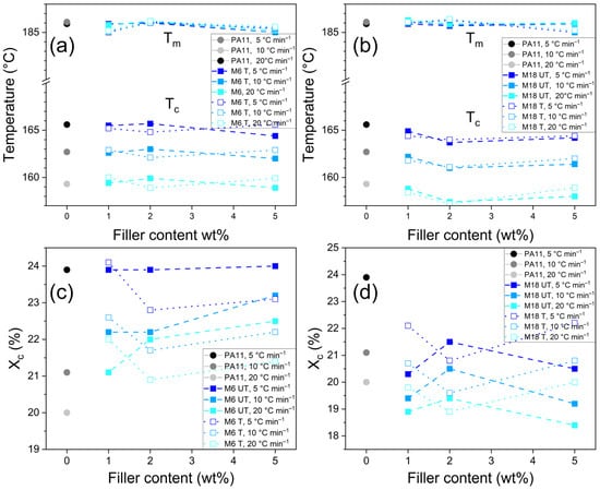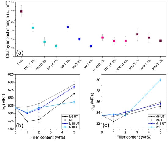 The present study explores the potential improvement of the mechanical properties of bio-based polyamide 11 (PA11) for demanding industrial application using natural and surface-treated mica at 1, 2 and 5 wt%. Suppressed water uptake by up to 4% was revealed with an unfavorable effect of the surface treatment. Impact strength decreased with filler content from 39.6 kJ m−2 to between 22–10 kJ m−2, while stiffness and resistance towards deformation improved: flexural modulus rose from 518.5 MPa to 596 MPa at 5 wt%-treated small particle, and elastic modulus changed from 542.7 MPa to 705.6 MPa. Particle size dependent trends were observed in crystallinity by Differential Scanning Calorimetry (DSC). Surface treatment promoted the presence of a mesophase form, which was also presented by Scanning Electron Microscopy (SEM). Dynamic Mechanical Analysis (DMA) revealed increased internal friction, temperature-dependent modifications in the elastic properties and a glass transition temperature of 36.6 °C. X-ray Diffraction (XRD) proved an unusual decrease in basal spacing of mica from 9.92 to 9.82 Å due to silanization; however, the compounding process provoked some increase again up to 10.03 Å. Results highlight a viable pathway to modify the properties of PA11 with a primarily role in the filler concentration and dimensions over the surface characteristics. Full article
