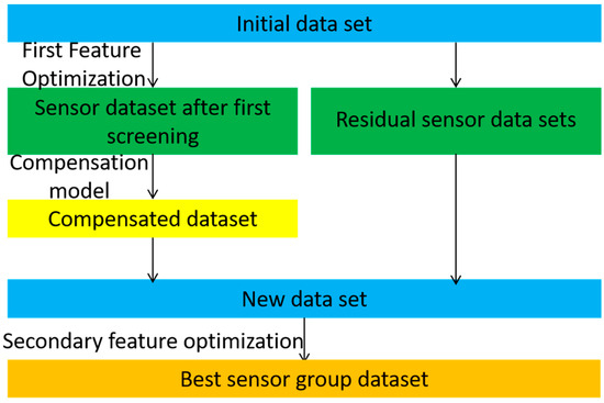 As an important instrument for olfactory detection in non-destructive testing (NDT), the electronic nose plays an important role in simulating olfactory detection. However, its performance is often affected by drift phenomena, including changes in sensor performance caused by environmental factors and olfactory fatigue due to long-term use. Although the effect of drift on the performance of electronic noses is widely recognized, there is still a relative lack of research on how drift affects feature optimization. This study presents a novel idea that drift factors not only affect the direct readings of the sensor but may also have a profound effect on the feature optimization process and hence the compensation of the electronic nose. To explore this concept, we chose temperature and humidity, the two most common environmental drift factors, for our experimental study. In our study, we verified the impact of drift factors on feature optimization and found a positive correlation between the concentration of sensor scores and the correct classification rate. Moreover, we adopted an innovative quadratic feature optimization method, which aims to reduce the influence of the drift factor on the feature optimization process and thus improve the drift resistance of the electronic nose. In our experiments, we found that the unweighted quadratic feature optimization method performs best in reducing the drift effect. After the optimization process, the recognition rate reaches 100% in the training set and 96% in the test set, which indicates that the electronic nose has improved significantly in terms of drift resistance. In summary, this study explores the effect of drift factors on feature optimization and proposes an effective treatment method, which provides a reference direction for the development and optimization of electronic nose technology. Full article